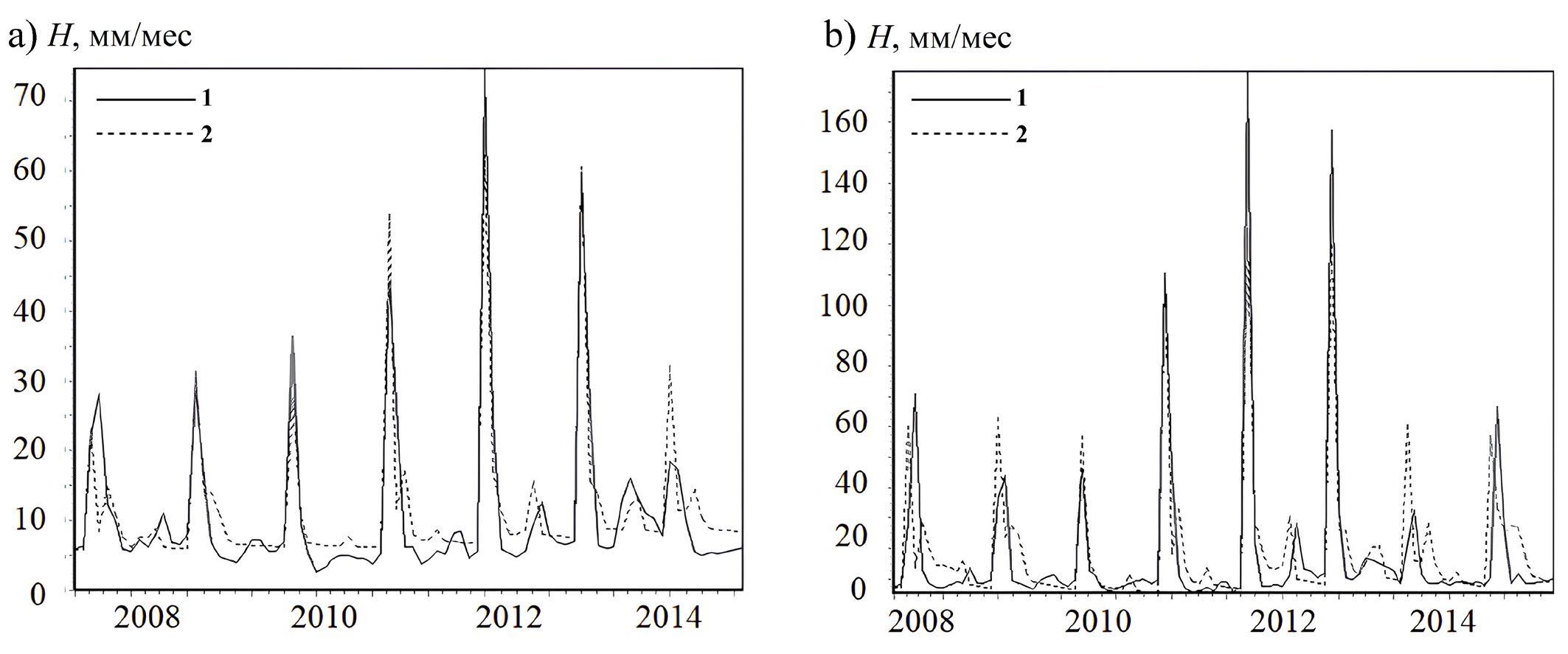 Рис.2. Наблюденные (1) и рассчитанные (2) среднемесячные слои стока с водосборов рек Кудьмы (а) и Линды (б).