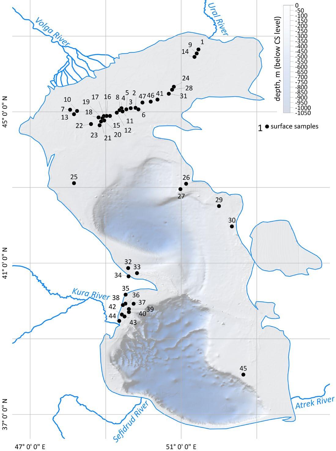 According to Gofman (1966), a total of 900 samples were initially taken from 300 sampling sites (three samples from each site), but the author received significantly reduced collection. Over the past decades, some of the samples were partially or completely lost, therefore, the quantitative analysis in this study was replaced by a qualitative one. As large areas of the Caspian Sea are shallow, especially in the northern part of the sea nearby Russian shore, we studied the near-shore zone. It includes sampling sites, where water depth is less than 50 m. A total of 45 near-shore sampling sites were studied, where the largest number of ostracod shells have been preserved (Fig. 1, 2).