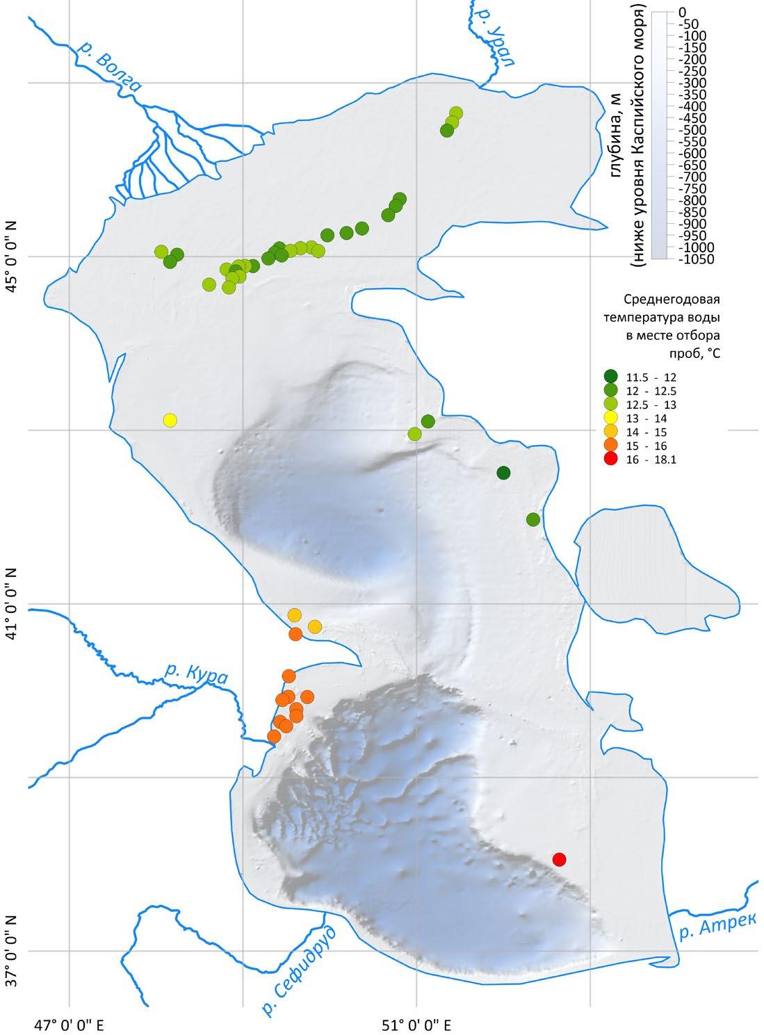 Here we present summarized data on our results of studying 45 near-shore sampling sites (Fig. 1) combined with published data, which was the first one to investigate the distribution of recent ostracods in the Caspian Sea and to discuss the influence of such factors as bottom sediments type, water temperature and salinity (Gofman, 1966; Schornikov, 1973; Yassini, 1986; Chekhovskaya et al., 2014). For each sampling site water depth, mean annual bottom water temperature and salinity at the time of sampling are available. This data is presented in Fig. 2, 3, 4.