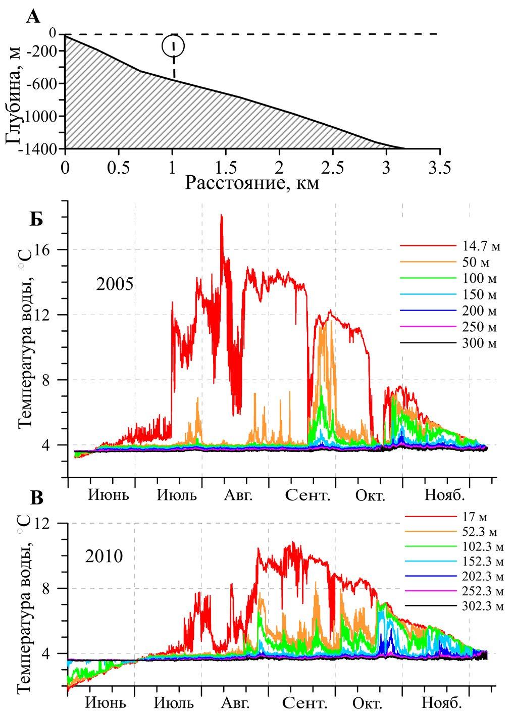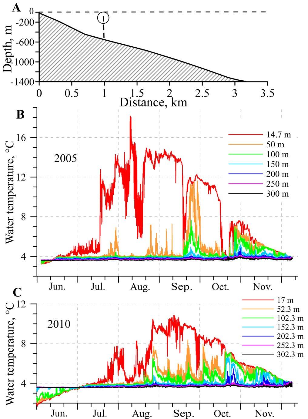 Usually, the annual maximum temperature on the water surface layer occurs in the middle of summer. In Lake Baikal, due to its huge size, the annual water temperature maxima (AWTM) near the shore is observed in late July-August and in the open parts of the lake in August-September. The largest vertical temperature and density gradients arise during the heating period in metalimnion, 20–30 days before the surface water temperature reaches its maximum (Naumenko and Guzivaty, 2022). Then the cooling begins, initiating convective mixing, which accelerates the deepening of the epilimnion, and the gradients deccrease. Heat is transferred to the underlying horizons, resulting in a shift of temperature maxima to greater depths and a decrease in their values. On every date, the penetration of heat to underlying horizons can be traced as the deepening of annual water temperature maxima from surface layer to bottom on a certain vertical (James, 1971; Stepanenko et al., 2018). In autumn, when the heat reaches the bottom, the overturn (that is, a vertical isothermia) arises, and the temperature at the bottom becomes the highest for the year in the large dimictic lake.
