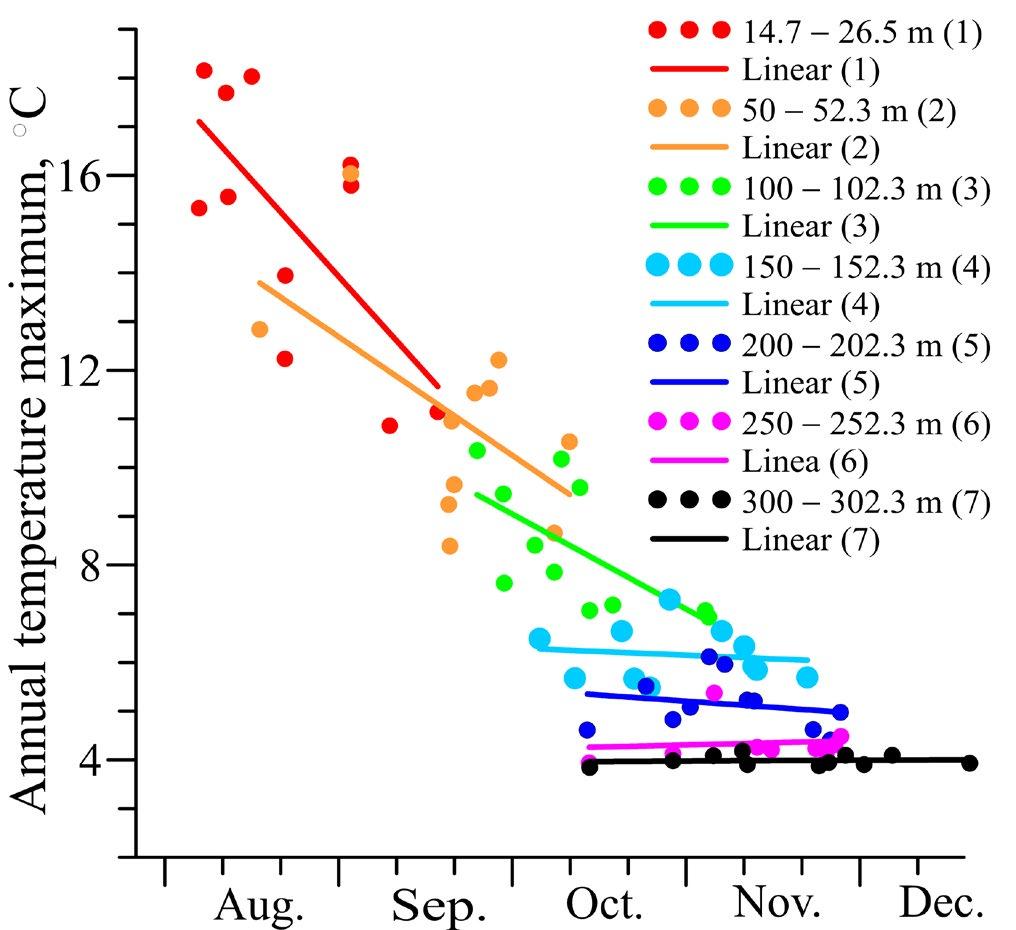 We can see that in the three upper horizons (up 100 m), there is a decrease in maximum temperatures with increasing dates. This means that the later the maximum temperature occurs, the lower it is. Starting from the horizon at 150 m, this pattern stops, and regardless of the date, the maximum temperature remains constant.