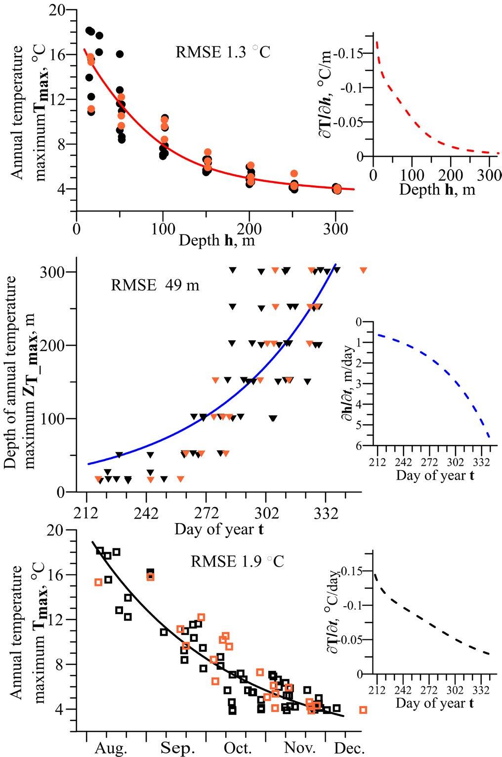 Differentiation of the obtained dependencies enables to estimate the rates of change of the studied parameters. Due to the nonlinearity of relationships for the studied seasonal cooling period of the southern part of Lake Baikal, the greatest variability of the maximum annual temperatures with time was observed in early August, right after the beginning of regular convective mixing at a depth of up to 50 m (Fig. 3, right upper and lower graph). At the same time, the rate of deepening is also maximum.