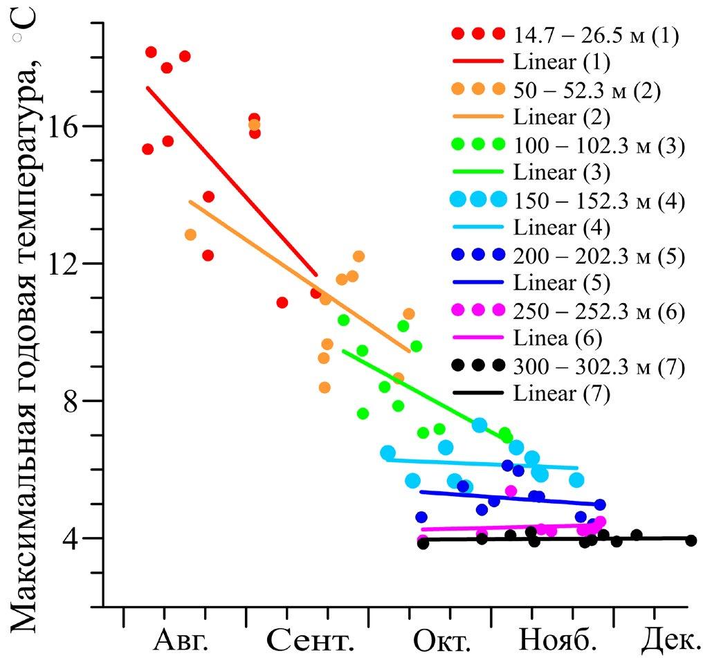 The deeper temperature structure demonstrates more gentle curves with a short maximum period. At a depth of more than 100 m, seasonal fluctuations are insignificant (Fig. 1).