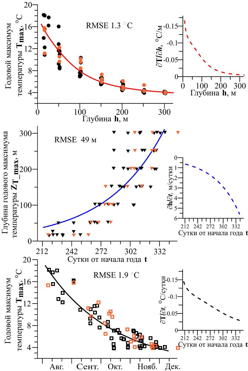 Differentiation of the obtained dependencies enables to estimate the rates of change of the studied parameters. Due to the nonlinearity of relationships for the studied seasonal cooling period of the southern part of Lake Baikal, the greatest variability of the maximum annual temperatures with time was observed in early August, right after the beginning of regular convective mixing at a depth of up to 50 m (Fig. 3, right upper and lower graph). At the same time, the rate of deepening is also maximum.