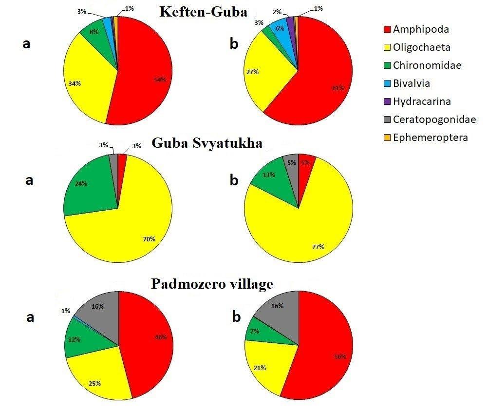 In terms of abundance in Keften-Guba and near Padmozero village, amphipods were dominates in bottom cenosis (from 46 to 54% of the total abundance) (Fig. 2). Oligochaetes accounted for a significant proportion of abundance (25-34%). Other groups accounted for less than 16% of total abundance.
