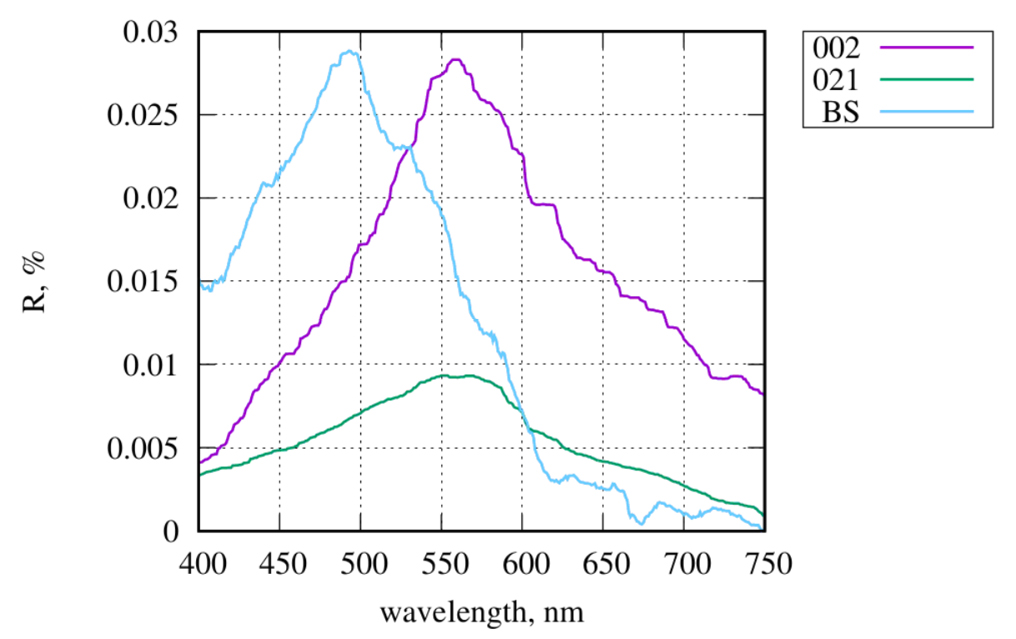 Fig.6. Examples of measurements of the water column spectral reflectance coefficient in Lake Teletskoye in August 2023 at station 002 and 021 and in the deep-water part of the Black Sea in April 2021.