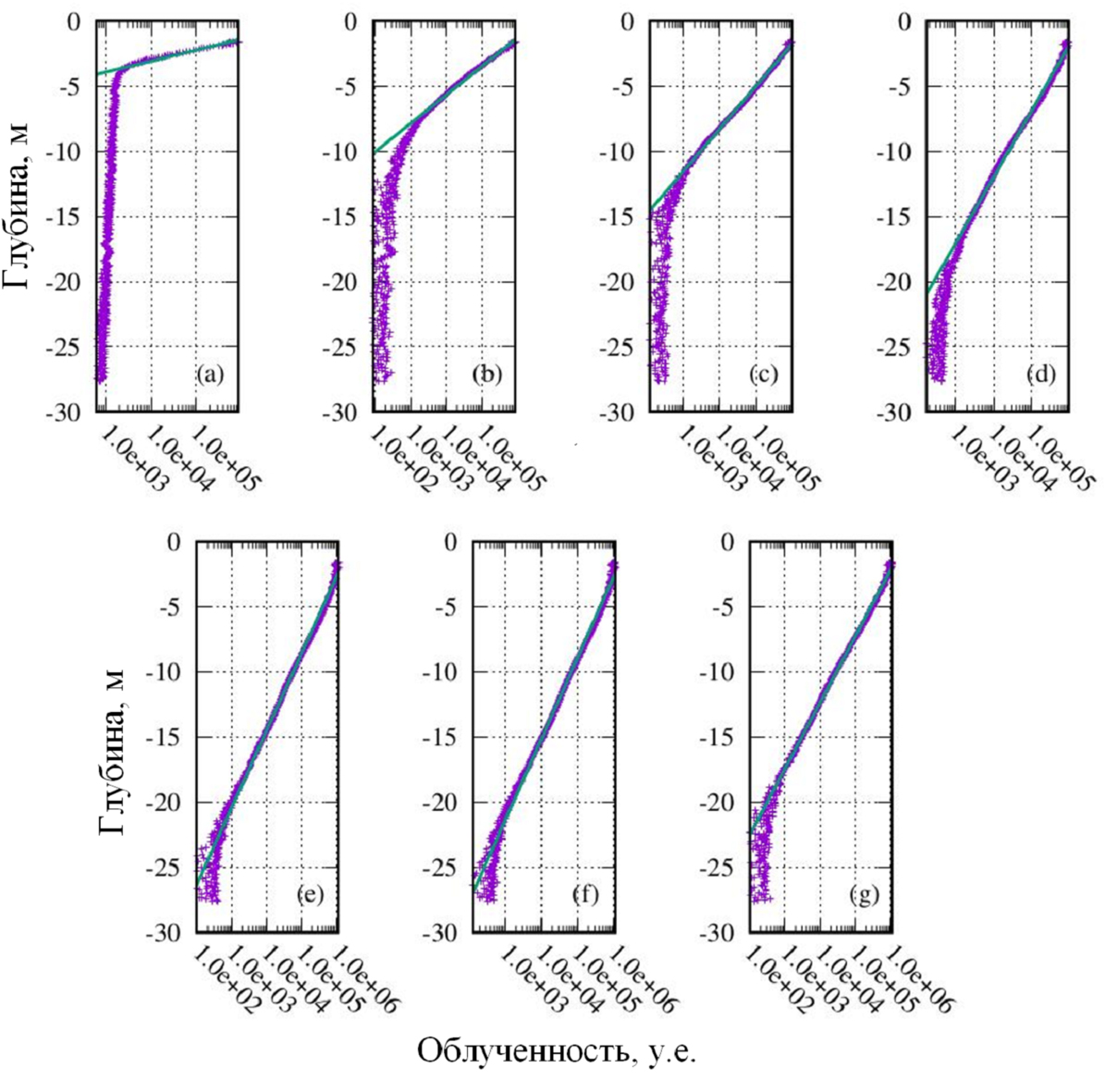Рис.2. Пример измерения профилей горизонтальной облученности на ст. 002 в семи спектральных каналах с центральной длиной волны: 380 нм (a), 443 нм (b), 490 нм (c), 510 нм (d), 555 нм (e), 590 нм (f) и 620 нм (g). Прямая линия – результат аппроксимации уравнением 4 для соответствующего спектрального канала.