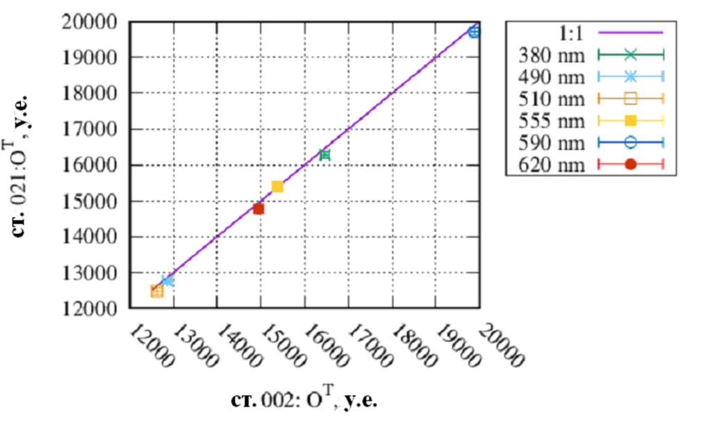 Перевод в физические единицы излучения OP(λi, 0-) выполнялся с помощью выражения: