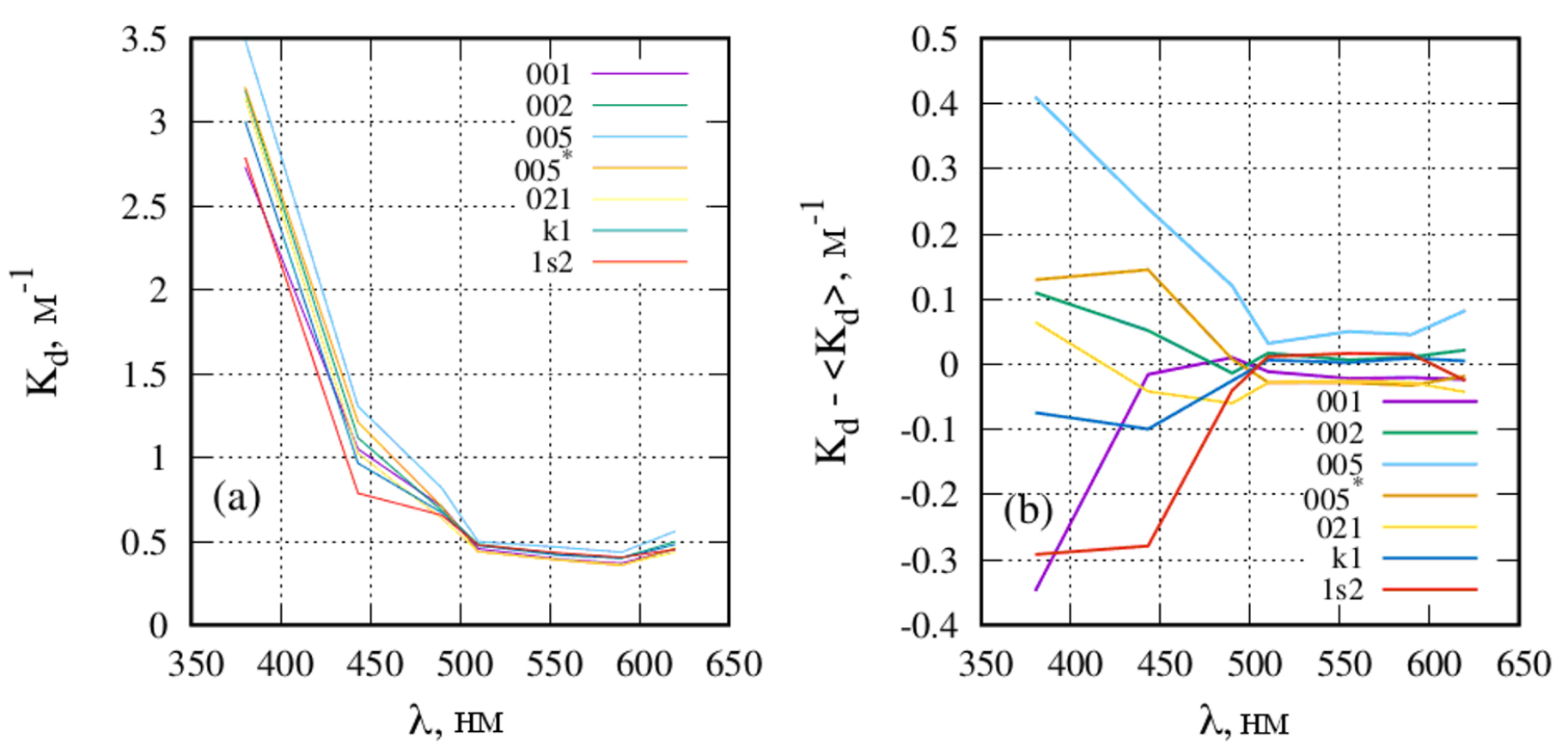 Минимальные значения Kd в спектральном канале с центральной длиной волны 590 нм в совокупности с его высокими значениями в коротковолновой области спектра указывают на доминирование поглощения, в первую очередь, окрашенной компонентой растворённого органического вещества.