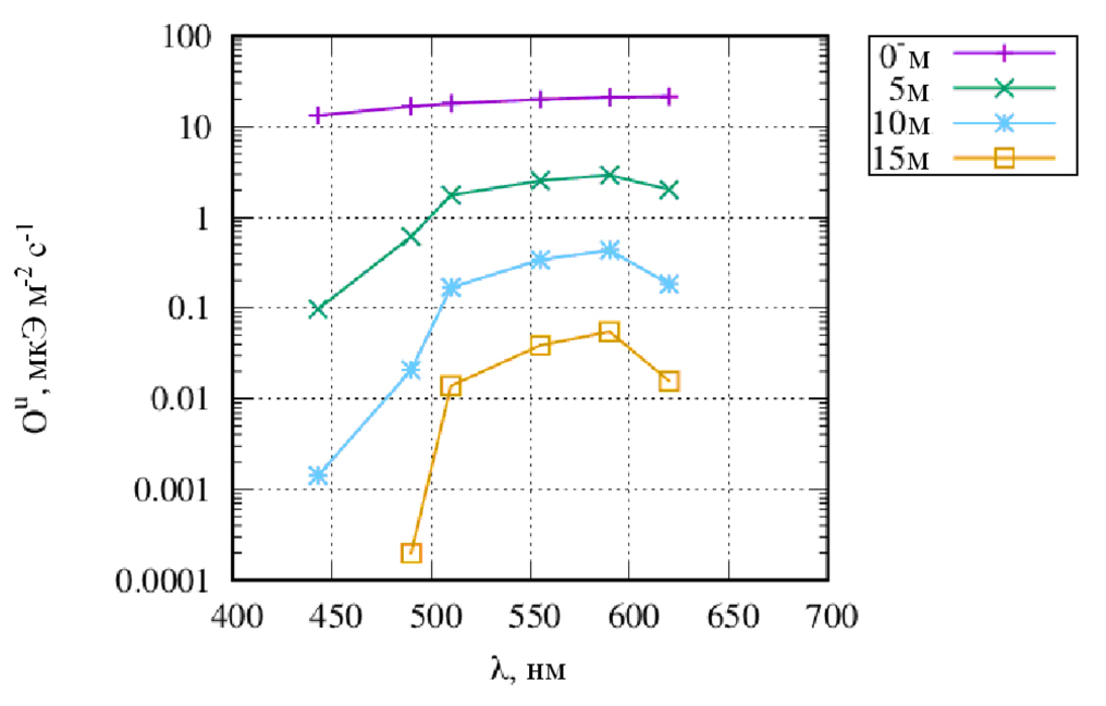 На Рис. 7 приведён пример восстановления спектра горизонтальной облученности в физических единицах, полученный по описанному выше методу (уравнения (2) – (6)) по измерениям на ст. k1. Характер поведения спектра облученности с глубиной (резкий провал в коротковолновой области спектра) указывает на высокое содержание растворённого органического вещества в водах Телецкого озера (Рис. 7). Особенность спектра горизонтальной облученности в коротковолновой области как функции глубины и положение его максимума, начиная от 5 м и ниже, который соответствует длине волны 590 нм, находятся в полном согласии с результатами, полученными годом ранее сотрудниками Института Биологии Южных Морей РАН (Churilova et al., 2023).