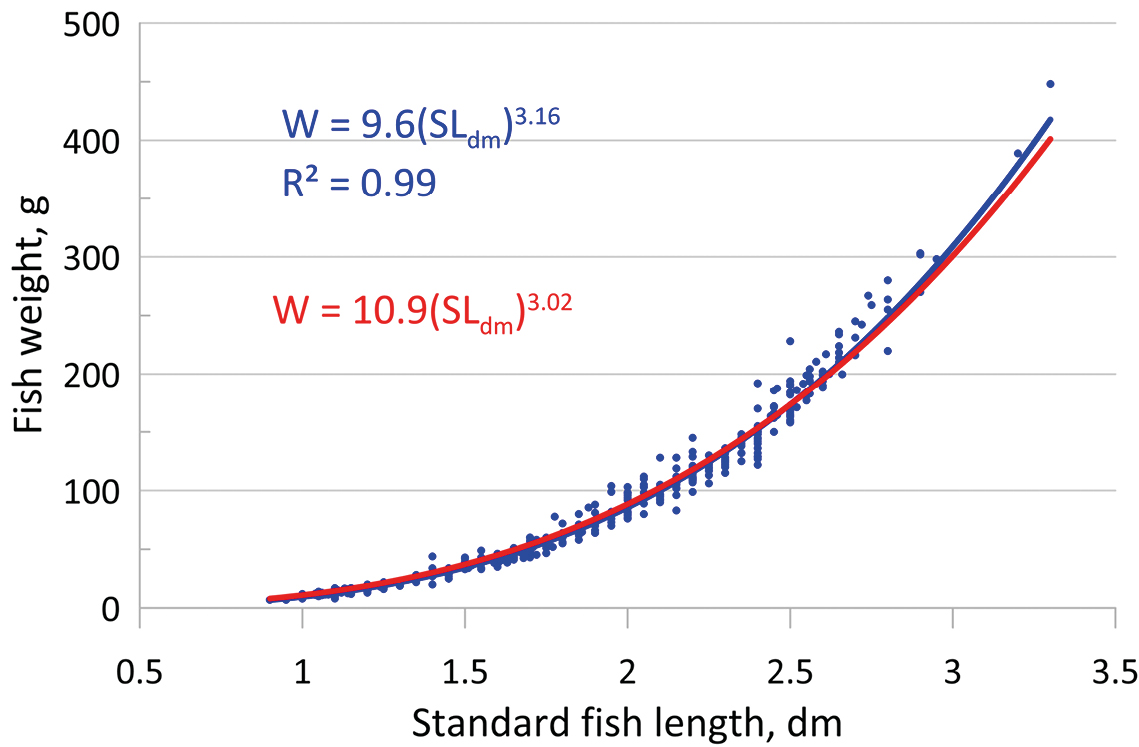 Size data. The length-weight relationship (LWR) is an important characteristic used for calculations in test hydroacoustic studies. As a result of regression analysis based on the 2024 data, we obtained LWR W=9.6(SLdm)3.16 with a very high determination coefficient R2=0.99 (Fig. 2). The average fish length (SL) was 17.6 cm, and the average weight–78 g. The use of our previous LWR based on long-term data, W=10.9(SLdm)3.02 (Anoshko et al., 2022), with such sizes, leads to an error in calculating the average weight of only 1.4% with a bias to the upside.