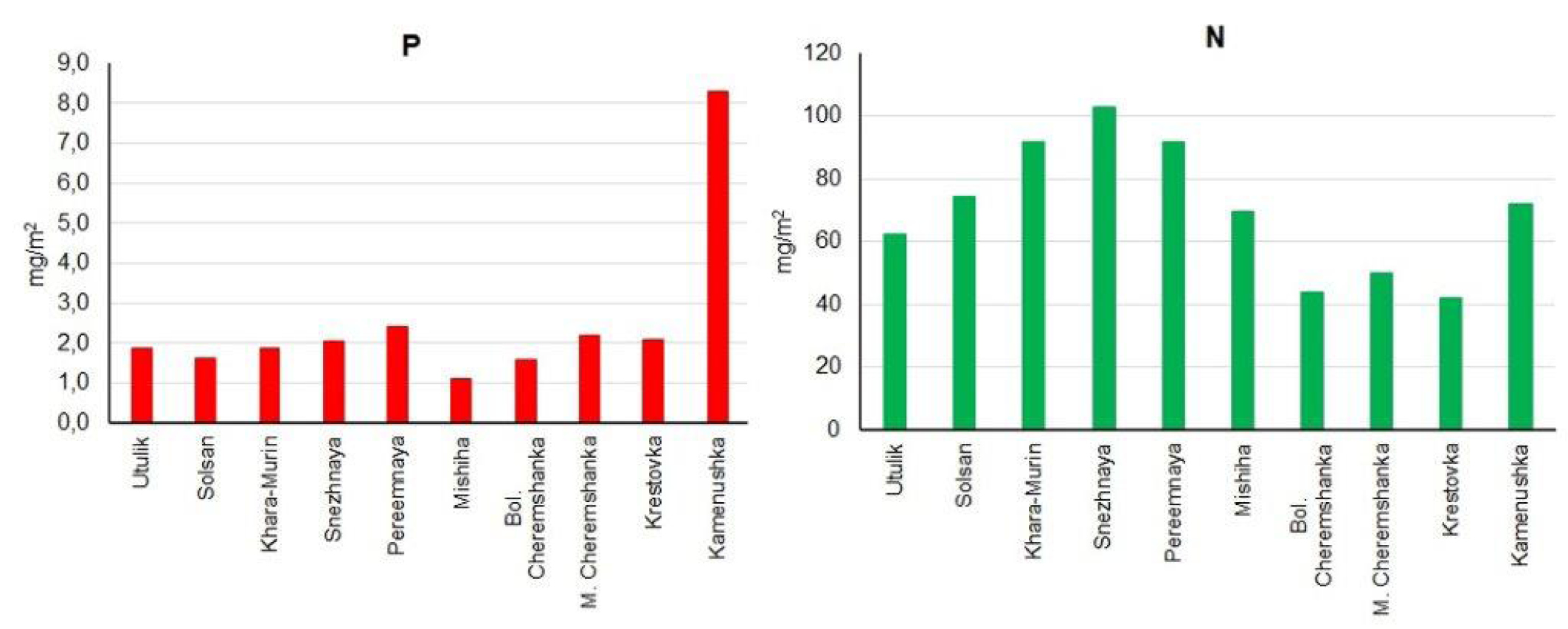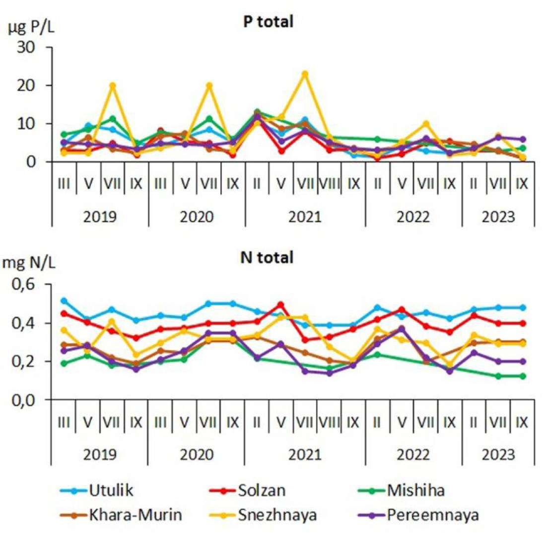 The content of Ntot in the water of tributaries varied from 0.12 to 0.51 mg/L. The highest concentrations were recorded in the Utulik and Solzan rivers, with mean annual values of 0.45 and 0.39 mg/L, respectively. The lowest recorded concentration, with mean annual values of 0.21 and 0.24 mg/L, was observed in the Pereemnaya and rivers (Fig. 3).