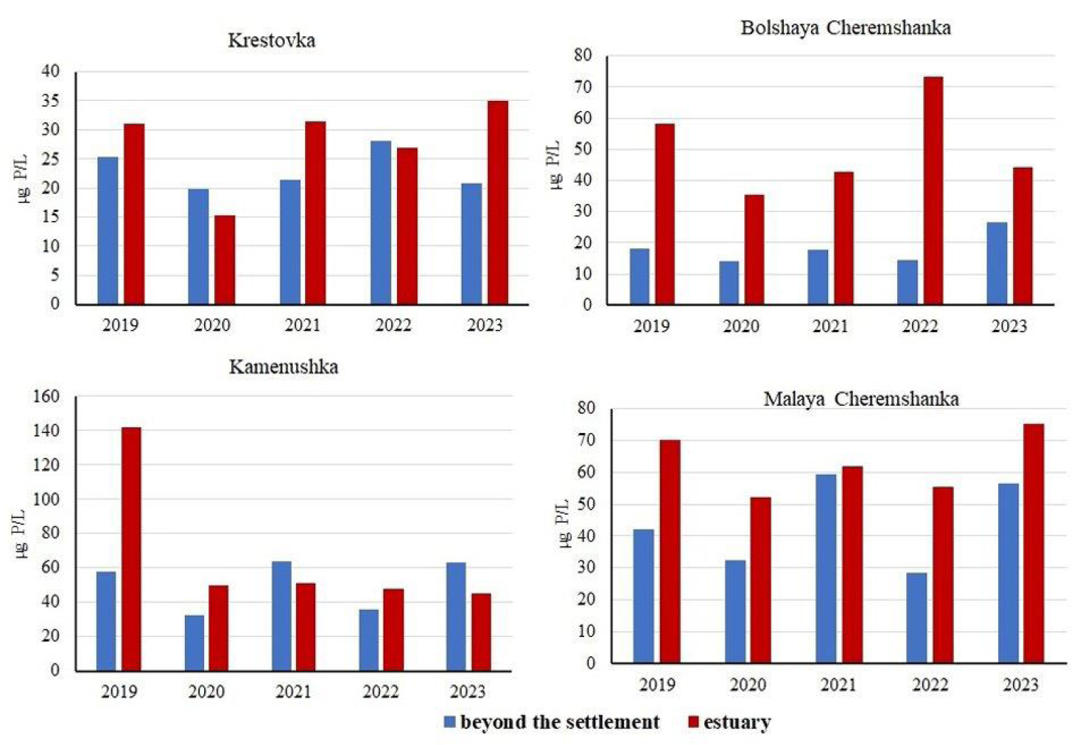 In Bol. and Mal. Cheremshanka, streams show higher concentrations of Ptot in the estuaries than in the upper reaches between 2019 and 2023 (Fig. 4). The Krestovka River and Kamenushka Stream statistics, however, show a different trend. Certain years (2020 and 2023 for the Krestovka River, 2021 and 2023 for Kamenushka Stream) have a higher content of Ptot in the upper reaches.