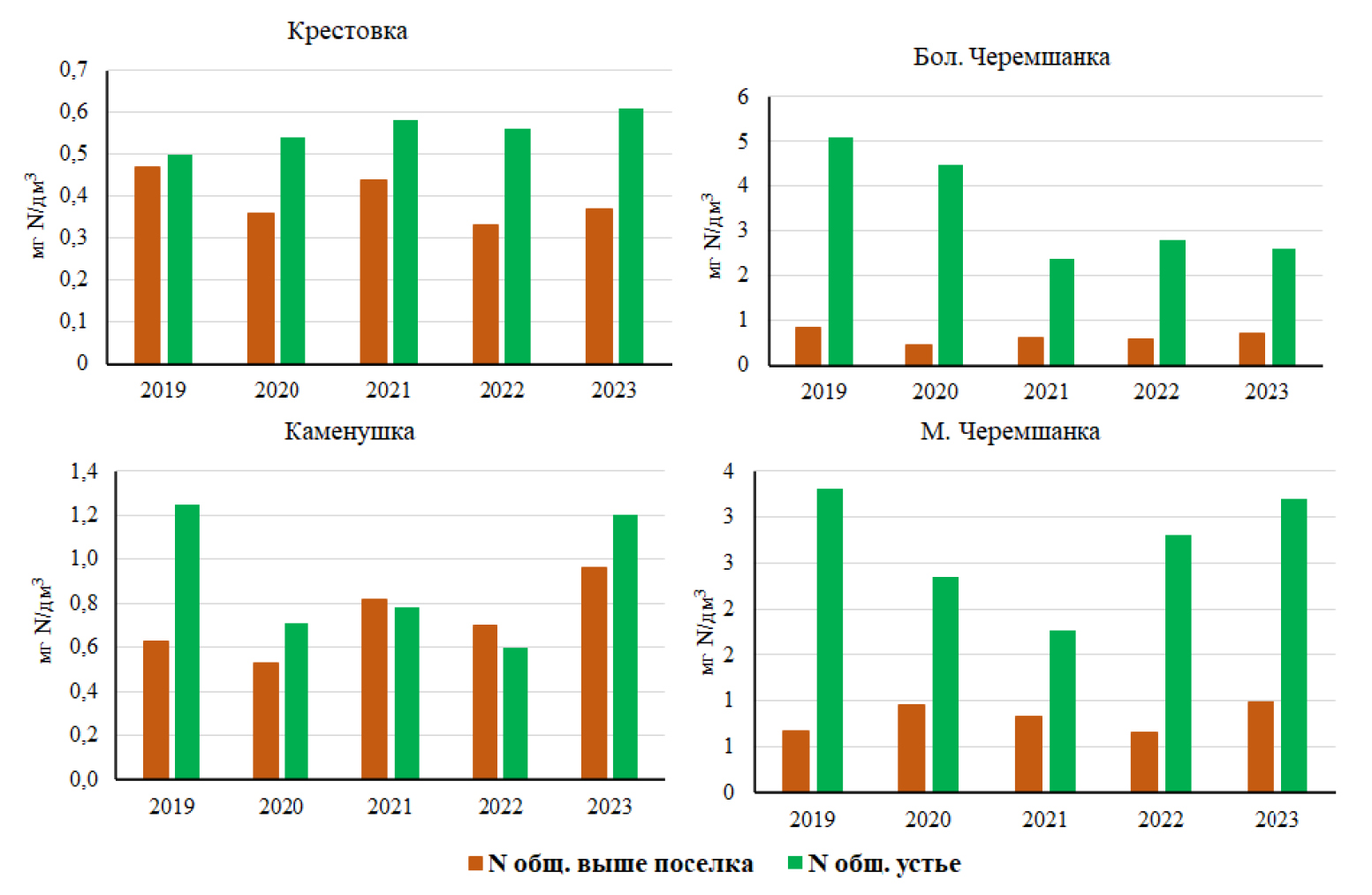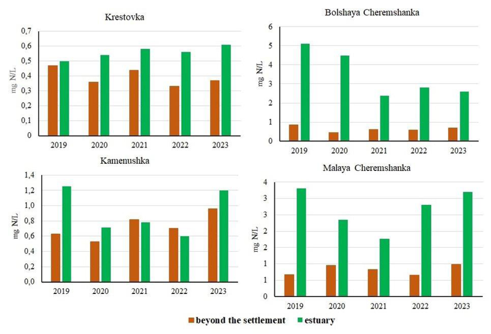 Determination of total nitrogen in the water of tributaries of the south-western coast of Lake Baikal was not carried out before, therefore the nitrate content as a component of mineral nitrogen is compared. The nitrate nitrogen content of the Krestovka River in 1950-1955 was found to vary from 0 to 0.14 mg/L with an average value of 0.05 mg/L (Votintsev et al., 1965). The concentrations of this component were higher in 2007-2012, at 0.02 - 0.23 mg/L, averaging 0.08 mg/L (Zagorulko et al., 2014). The range of variation for the period 2019-2023 was 0.02-1.01 mg/L. The average nitrate concentration was found to be five times higher than that observed 70 years ago, and three times higher than that observed 10 years ago. For Bol. Cheremshanka stream, nitrate content was recorded at a range of 0.02-0.81 mg/L between 1950-1955, with an average value of 0.33 mg/L. In 2019-2023, the concentration of this component ranged from 0.18 to 5.4 mg/L. The average value was six times higher than that recorded in the 1950s.