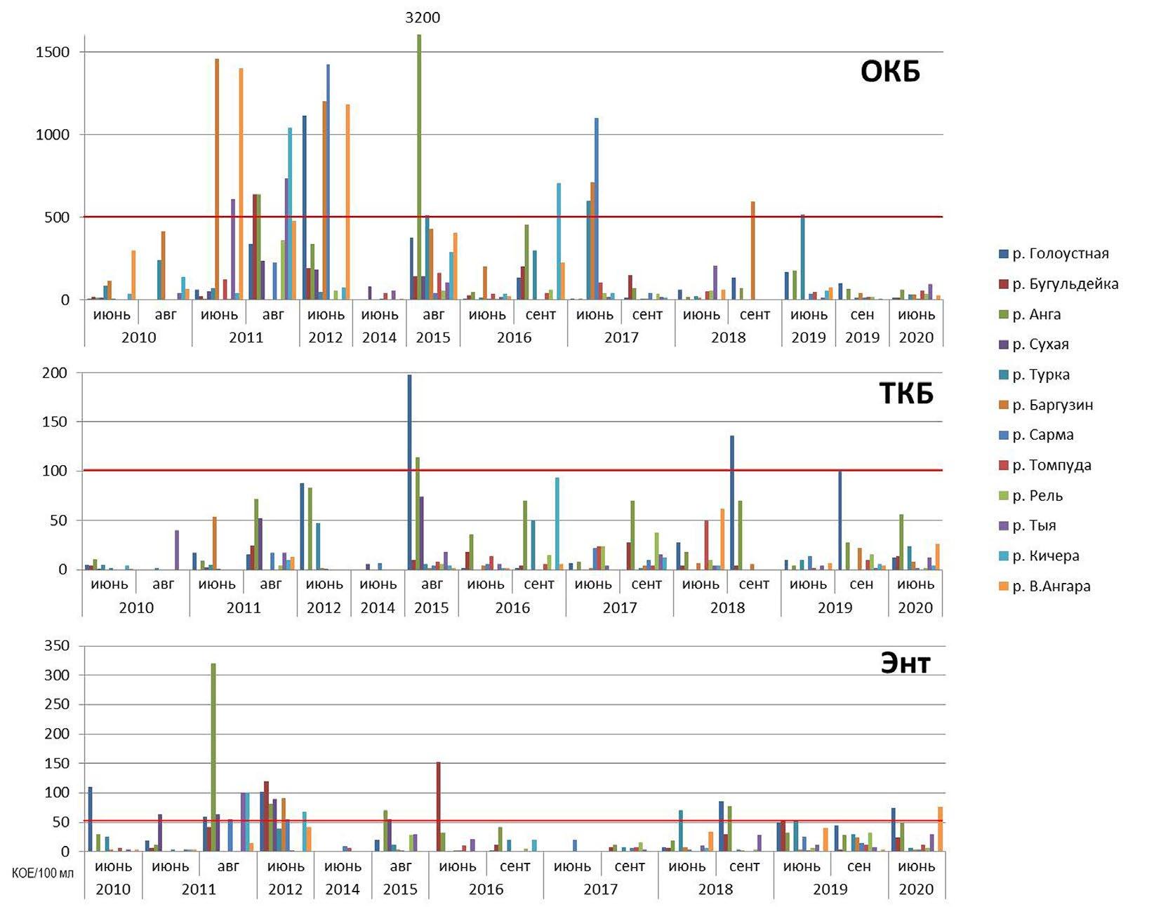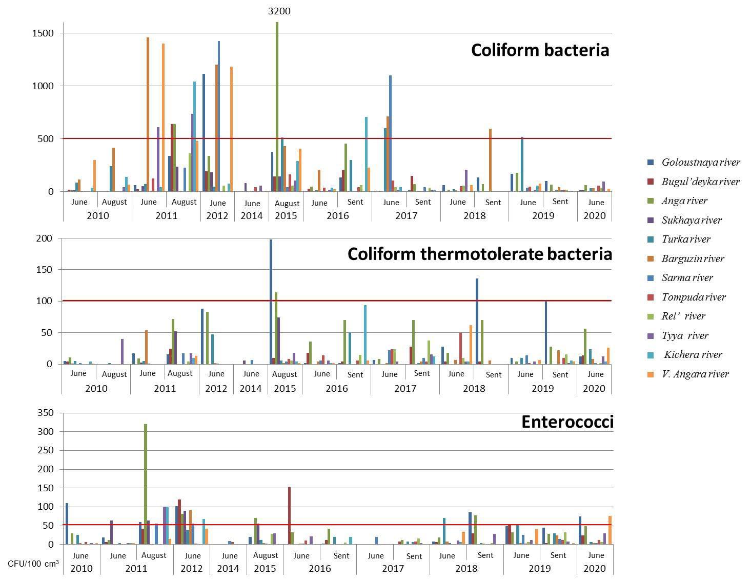 In the waters of the estuaries of rivers flowing into the lake, the number of sanitary indicatory-groups of bacteria in 2010–2020 was (Fig. 2), on average, by one order more than their content in the pelagic zone – the Goloustnaya, Buguldeika, Turka, Anga, Barguzin, Sukhaya rivers, as well as the Selenga delta (Drucker et al., 2022). The most unfavorable period for water quality was in August 2011 and May-June 2012, when the number of non-standard water samples was highest. In August 2010, May-June 2014, and September 2017, all river samples taken corresponded to “satisfactory” surface water quality indicators.