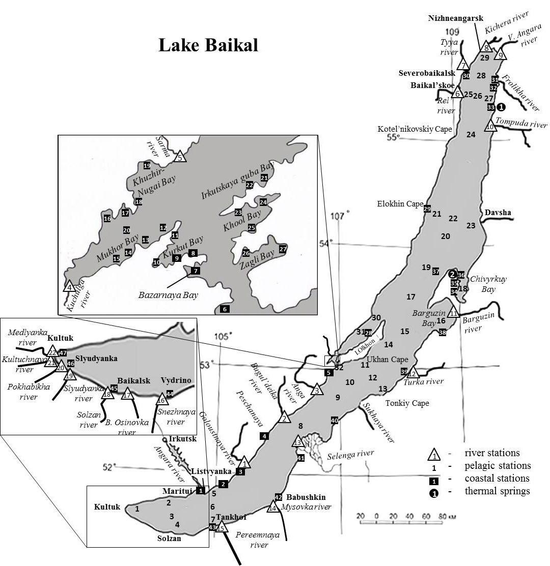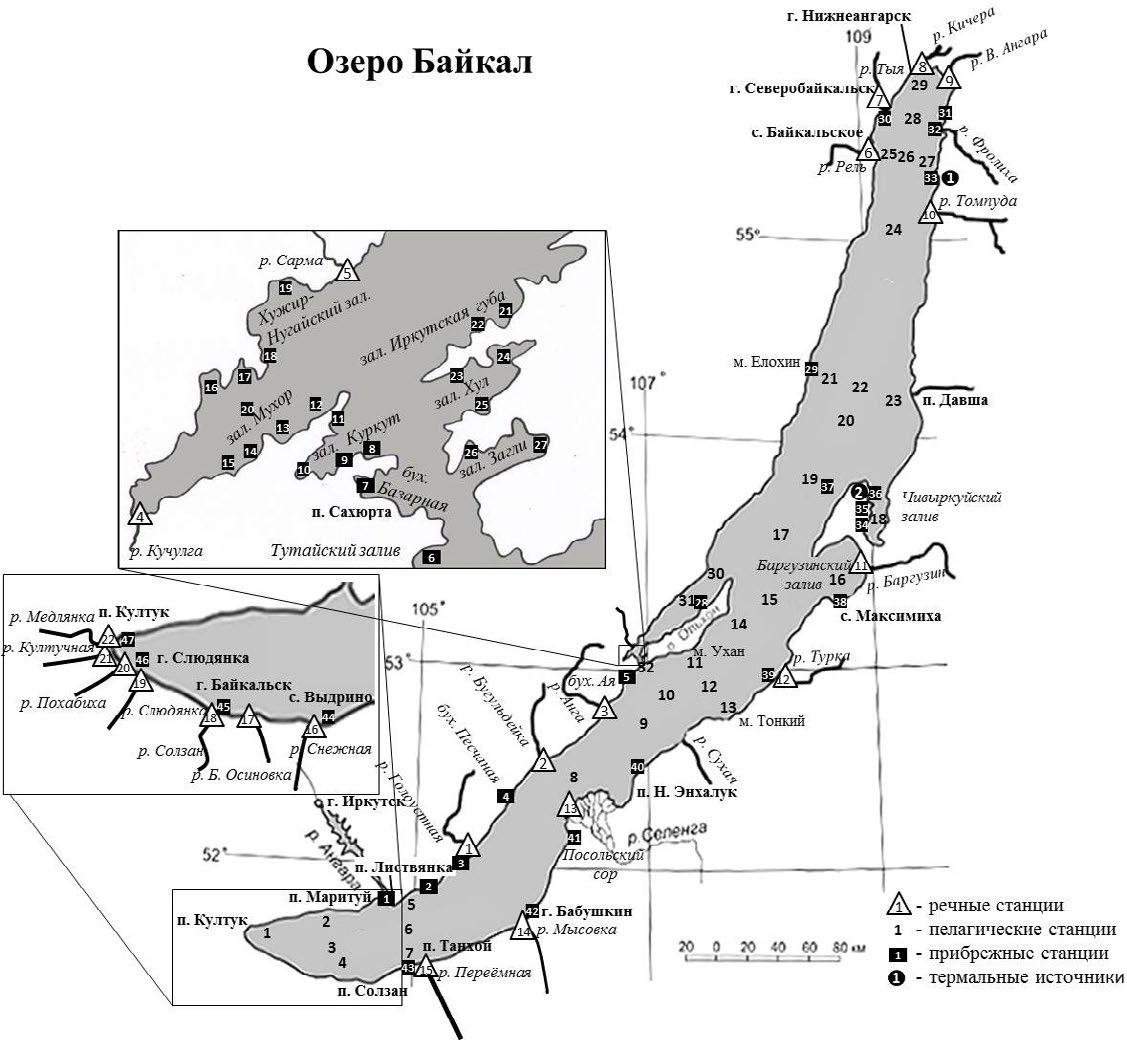 Fig.3. The scheme of sanitary-bacteriological monitoring of Lake Baikal. River stations: 1 – Goloustnaya, 2 – Bugul’deika, 3 – Anga, 4 – Kuchulga, 5 – Sarma, 6 – Rel’, 7 – Tyya, 8 – Kichera, 9 – V. Angara, 10 – Tompuda, 11 – Barguzin, 12 – Turka, 13 – Selenga, 14 – Mysovka, 15 – Pereemnaya, 16 – Snezhnaya, 17 – B. Osinovka, 18 – Solzan, 19 – Slyudyanka, 20 – Pokhabikha, 21 – Kultuchnaya, 22 – Medlyanka. Pelagic stations: 1 – 12 km from Kultuk, 2 – 3 km from Maritui, 3 – Maritui‒Solzan, 4 – 3 km from Solzan, 5 – 3 km from Listvyanka, 6 – Listvyanka–Tankhoi, 7 – 3 km from Tankhoi, 8 – Krasnyi Yar–Kharauz, 9 – Anga‒Sukhaya, 10 – Boldakova–Malye Olkhonskie vorota, 11 – 3 km from Ukhan, 12 – Ukhan–Tonkiy, 13 – 3 km from Tonkiy, 14 – 7 km from Izhimei, 15 – Khoboi–Krestovyi, 16 – Barguzin Bay, 17 – Academicheskiy Ridge, 18 – Chivyrkui Bay, 19 – Solnechnaya–Ushkanyi Islands, 20 – Zavorotnyi–Sosnovka, 21 – 3 km from Elokhin, 22 – Elokhin–Davsha, 23 – 3 km from Davsha, 24 – Kotelnikovskiy–Amnundakan, 25 – 3 km from Baikalskoe, 26 – Baikalskoe–Turali, 27 – 3 km from Turali, 28 – Tyya–Nemnyanka, 29 – 7 km from Nizhneangarsk, 30 – Aral–Khoboy, 31 – Maloye More Strait, 32 – Malye Olkhonskie vorota. Coastal stations: 1 – Listvyanka, 2 – B. Koty, 3 – B. Goloustnoe, 4 – Peschanaya Bay, 5 – Aya Bay, 6 – Tutaiski Bay, 7 – Bazarnaya Bay, 8 – Shchuchiy Bay, 9 – Radost‘ Bay, 10 – Kurkut Bay, 11 – Burlyuk Сape, 12 – Chukotka Bay, 13 – Mandarkhan Bay, 14 – Zuun-Khagun Bay, 15 – Baruun-Khagun Bay, 16 – Shida Bay, 17 – Ulirba Сape, 18 – Khuzhir-Nugai Bay, 19 – Sarma, 20 – Mukhor Bay, 21 – Irkutskaya guba Bay, 22 – Tutyrkhey Bay, 23 – Kharin-Irgi Bay, 24 – Khool Bay, 25 – Khytyrhey Bay, 26 и 27 – Zagli Bay, 28 – Khuzhir, 29 – Elokhin Сape, 30 – Severobaikalsk, 31 – Frolikha Bay, 32 – Аyaya Bay, 33 – Khakusy Bay, 34 – Monakhovo, 35 – Kurbulik, 36 - Zmeinaya Bay, 37 – Peshcherka Bay (Ushkany Islands), 38 – Maksimikha, 39 – Turka, 40 – N. Enkhaluk, 41 – Posol’skiy sor, 42 – Babushkin, 43 – Tankhoi, 44 – Vydrino, 45 – Baikalsk, 46 – Slyudyanka, 47 – Kultuk. Termal springs stations: 1 – Khakusy, 2 – Zmeinyy.