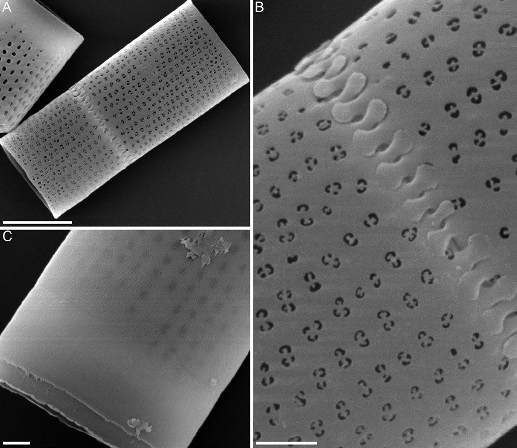Fig.1. Fine structure of valves and girdle bands of Aulacoseira islandica strain 3Mr553 (SEM). Scale: A – 5 µm; B, C – 1 µm.