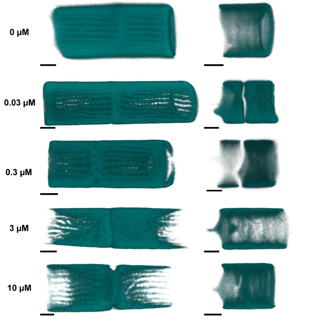 Fig.3. Valves (left) and girdle bands (right) of A. islandica formed under the influence of different concentrations of gatastatin (indicated on the left) (LSM, 3D-reconstruction). Scale bar – 2 µm.