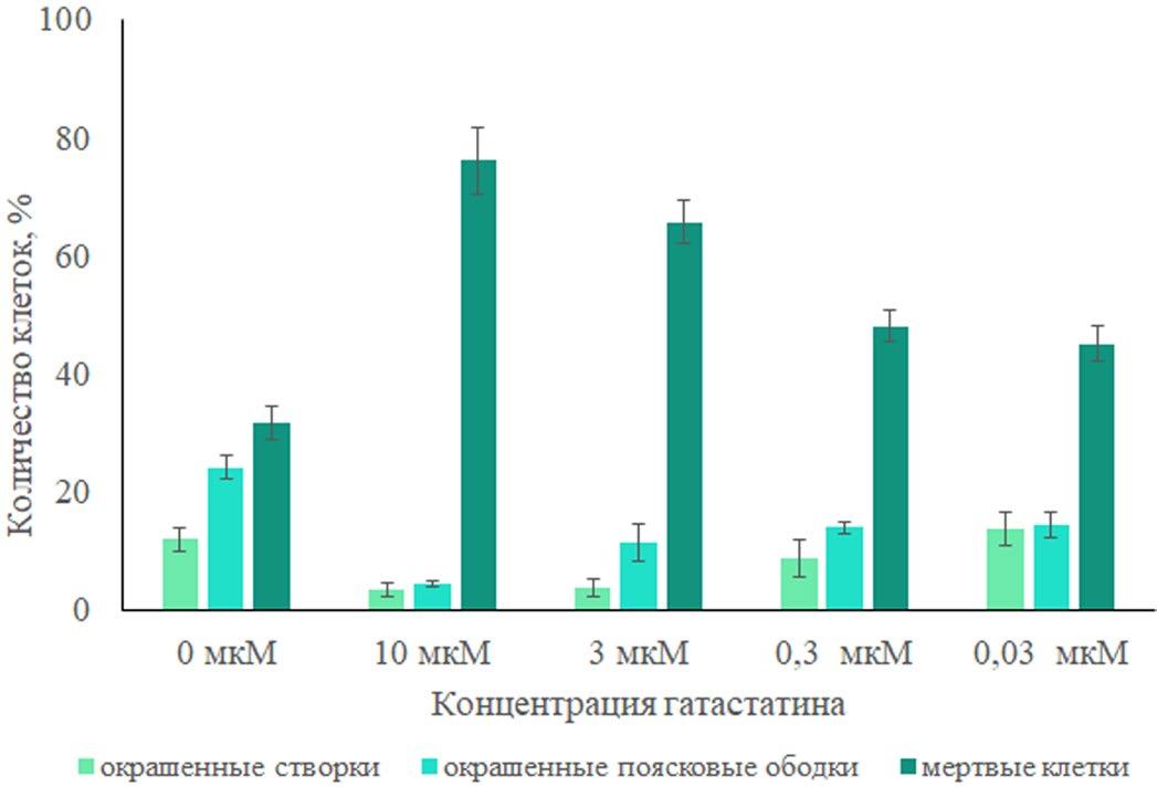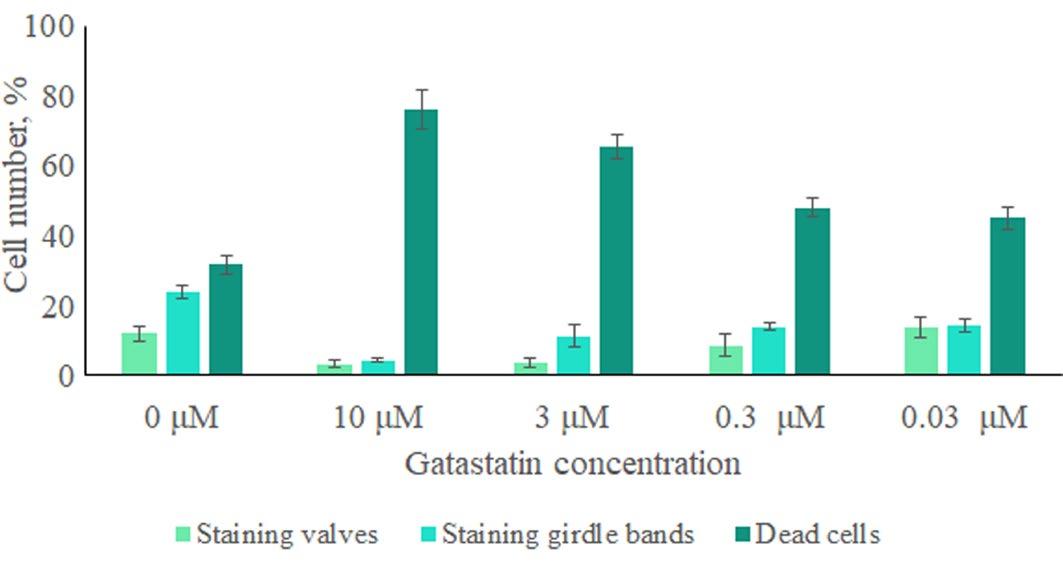 The studied strain was characterized by the presence of at least 30% dead cells in the culture (Fig. 4). Most cells formed actively both valves and girdle bands. At all gatastatin concentrations, the number of dead cells was higher than in the control. The number of colored valves was lowest at gatastatin concentrations of 3 and 10 µM, while at gatastatin concentrations from 0.03 to 3 µM, the number of girdle bands remained approximately the same, but less than in the control.