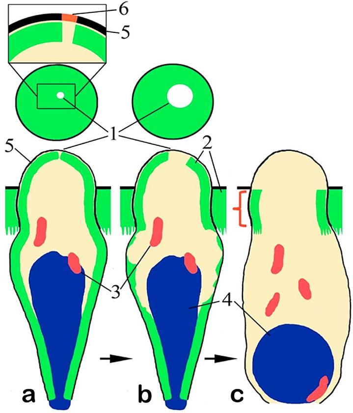Fig.1. Young (a, b) and mature (c) stages of olfactory receptor cells morphological differentiation (by laser scanning confocal microscopy) of Cottocomephorus inermis Jakowlew, 1890 (Cottoidei). (А) – The ellipsoidal nucleus with mitochondria and thick layer of perimembrane F-actin inside the young cell. At the dendritic terminal the perimembrane F-actin layer has a pore which opens to cytoplasm. The apical fragment with the pore is highlighted and enlarged (the membrane patch upper the pore painted with red color); (b) – the hole of the pore is significantly expanded due to actin microfilaments dissociation; (c) – mature cell containing the F-actin only in the tight junctions area (pointed with brace). Notation: 1 – pore in the actin layer; 2 – F-actin; 3 – mitochondria; 4 – nucleus; 5 – plasmalemma; 6 – the membrane patch upper the pore in actin layer.