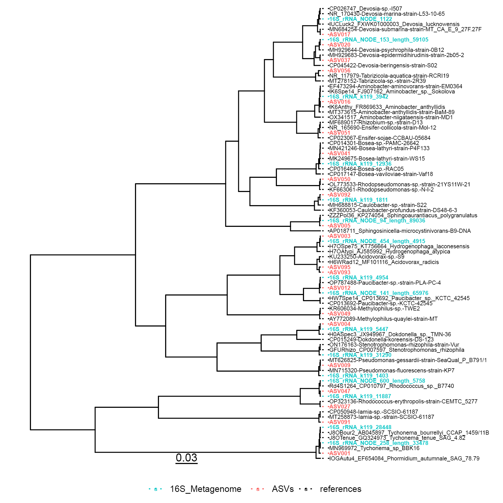 2. Рис.1. Ультраметрическое филогенетическое дерево, основанное на выравнивании ДНК фрагмента 16S рРНК гена. Красным выделены ASV последовательности, синим – фрагменты гена 16S рРНК из метагенома, черным – ближайшие соседи по данным BLASTn-поиска