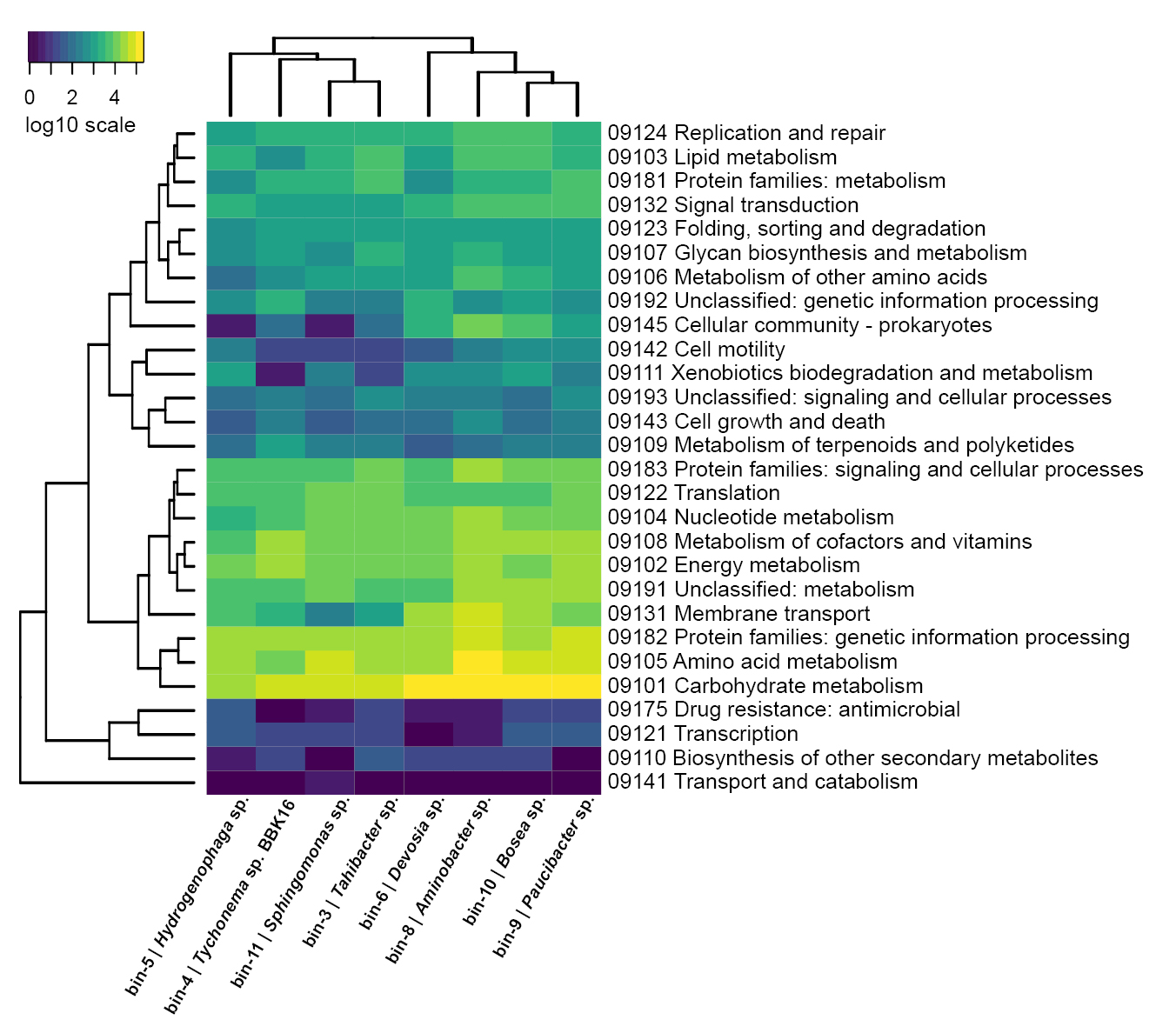 3. Рис.2. Тепловая карта представленности метаболических путей по базе данных KEGG в метагеноме Tychonema sp. BBK16. Цветом обозначено количество генов, аннотированных в каждом из геномов.