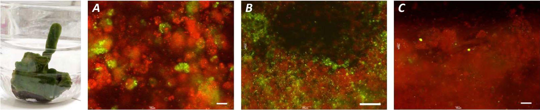 Fig.1. The sponge L. baicalensis in an aquarium and fluorescence images of sponge slices after 8 days of culturing in the presence of nanoplastics. Red fluorescence – chloroplasts, green – plastic nanoparticles. A - PS 200 nm, B and C -PVC 85 nm particles. Particles were stained with dibenzylfluorescein. Plastic concentration was 1 (A and B) and 0.1 (C) mg/L. Scale bars represent 25 (A), 50(B) and 75 (C) µm.
