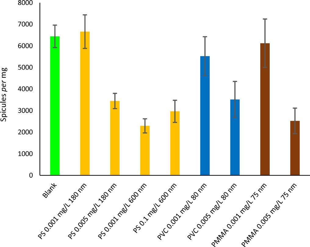 We performed two series of experiments with primmorphs of L. baicalensis. First (Fig. 2), PVC and PS nanoparticles were added at a concentration of 0.01-10 mg/L. The fluorescent dye NBD-N2 was added to detect the spicules formed during the experiment. After one month, we found a more than threefold reduction in the number of new spicules in the presence of plastic at any concentration tested. The following experiment (Fig. 3) shows no effect of nanoplastics at a concentration of 0.001 mg/L for three months. Sub-micrometer PS particles of 600 nm reduced spicule formation at a concentration of 0.001 mg/L. All three plastics were toxic at a concentration of 0.005 mg/L.