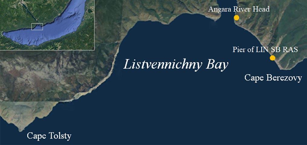 Fig.1. Map of Listvennichny Bay and measurement locations (https://earth.google.com/web – accessed 29.11.2023). The inset shows the location of Listvennichny Bay in the Southern Baikal.