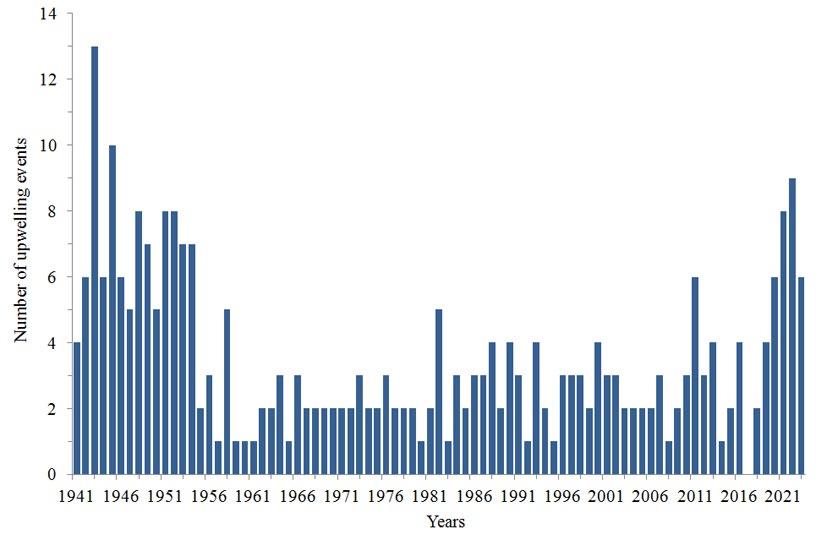 A total of 285 upwelling events were identified and treated between May and October 1941-2023. Up to four upwelling events were recorded in each individual month. During the year, 1-3 upwelling events were most often recorded (Fig. 3). The maximum number of upwelling events was 13 within one year (in 1943).