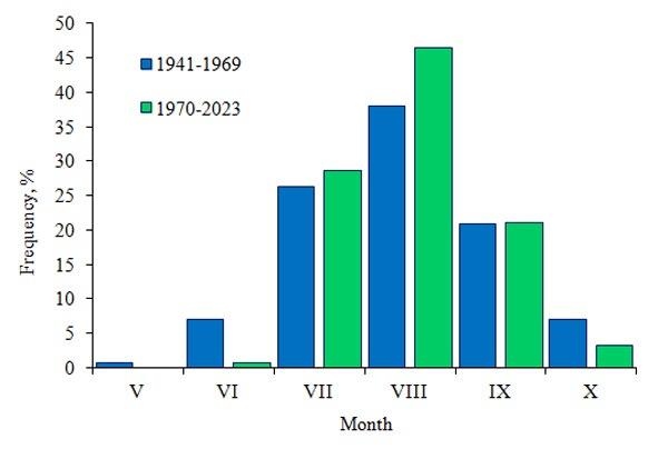 A total of 129 upwelling events (an average of 4.5 events per year) were recorded for the period of 1941 to 1969, and 157 upwelling events (an average of 2.9 events per year) were detected from 1970 to 2023. Figure 4 shows the frequencies of upwelling events for selected months in two periods. Comparison of the two periods revealed a change in the distribution of upwellings by month: compared to the 1941-1969, 1970-2023 shows a greater concentration of upwelling in August (from 38.0% to 46.5%), neighboring July and September showed minor changes in the number of upwellings, and in all other months the number of upwelling decreased significantly (from 0.8% to 0% in May, from 7.0% to 0.6% in June, and from 7% to 3% in October).