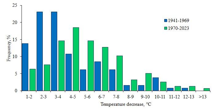 The magnitude of water temperature drop during upwelling has also changed. Thus, in 1941-1969 and 1970-2023, the mean values were 4.2 and 5.3°C, and the maximum was 12.0 and 13.5°C, respectively. The pattern of the frequency distribution of upwellings by temperature drops has also undergone a transformation (Fig. 6). While, in 1941-1969, 60% of upwellings were characterized by a 1-4°C temperature drop, in 1970-2023, 61% of upwellings showed a temperature drop of 3-7°C.