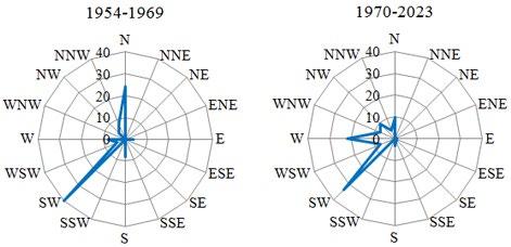 Analyses of available wind data (since 1954) also enabled us to assess changes in wind characteristics. In 1954-1969 (Fig. 7), upwelling most often developed under N and SW winds (64% of events), and from 1970 under W and SW winds (55% of events). The mean and maximum wind speeds for the considered periods differ a little and are 6 (12) m/s during 1954-1969 and 5 (14) m/s during 1970-2023.