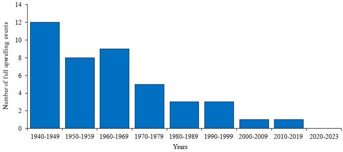 There were 42 full upwelling events identified from 1941 to 2023; of these, 29 occurred from 1941 to 1969 and 13 occurred from 1970 to 2023. The maximum number of full upwelling events 18 and 13 occurred in August and September, respectively, while 7 events were detected in October. Two full upwellings each were recorded in June and July, and one in May. The distribution of full upwelling by decades is shown in Fig. 8.