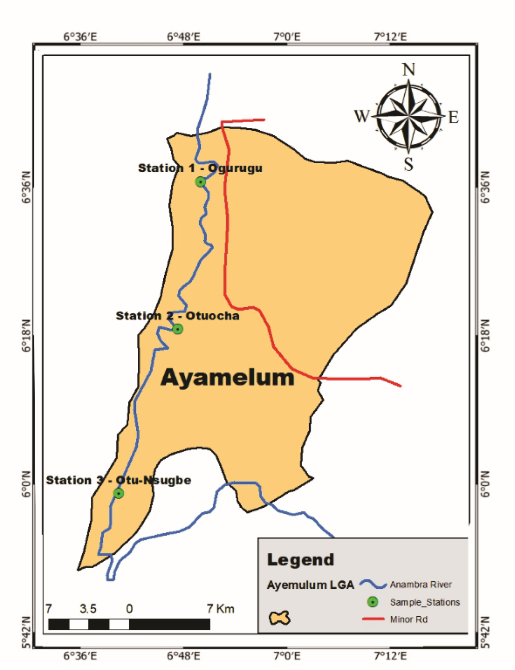 The Anambra River Basin is situated in south-east of Nigeria, it is approximately 207.4 km to 210 km long (Odo, 2004) and rises from the Ankpa hills (ca. 305-610m above sea level) and flows into the River Niger at Onitsha (Odo, 2004). It is spatially located between latitudes 6°00’N and 6°30’N and longitudes 6°45’E and 7°15’E. A total of 14014 km2 are drained by the river basin (Odo, 2004) (Fig.1).
