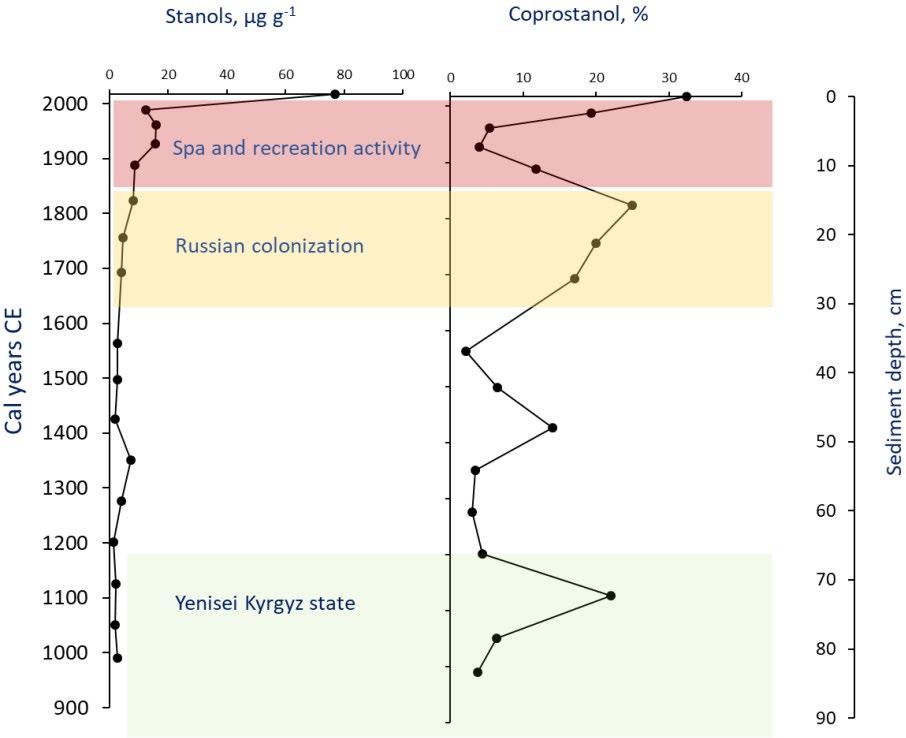 The raised proportion of coprostanol in the modern period indicates an increase in anthropogenic fecal influx into Lake Shira. In earlier periods of the history of Khakassia, particularly during the existence of the Yenisei Kyrgyz state (VIII - XIII centuries AD), an increase in coprostanol share indicates a possible increase in human presence in the Lake Shira drainage basin.