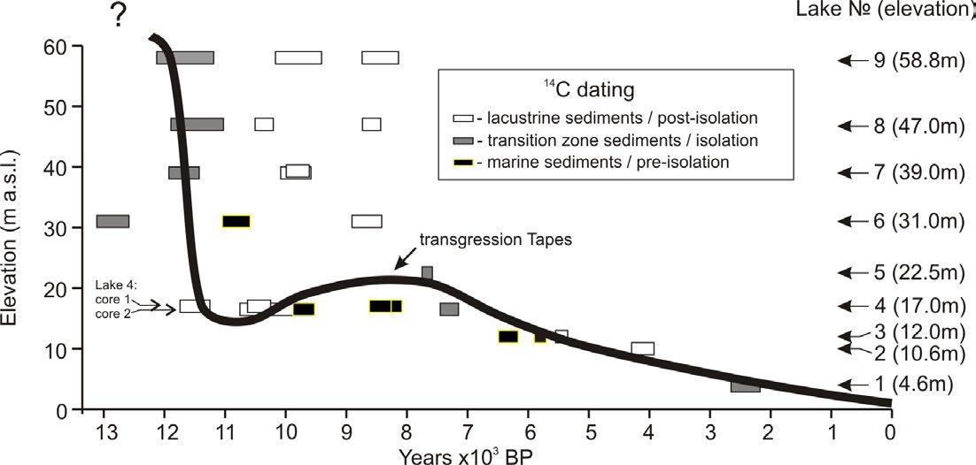 Analysis of the sea-level (Fig.) shows that after the deglaciation of this area, the sea level was above 59 m relative to the current. During the Late Glacial and the beginning of the Holocene, there was a rapid regression of the coastline of the sea due to the uplift of the earth’s surface. Rate of the regression was approximately 40 mm per year. About 11,500 cal years BP, the sea level fell below 17 m a.s.l. As a result of the Tapes transgression, which took place within the North Atlantic, the lake No. 4 connected with the sea. During the Tapes transgression, the rise of the sea coastline was more than 5 meters in the study area. At the maximum of the Tapes transgression, the sea coastline located slightly below the 21 m a.s.l. After 7300 cal years BP, a gradual regression of the coastline of the sea began at an average rate of about 2-3 mm/year.