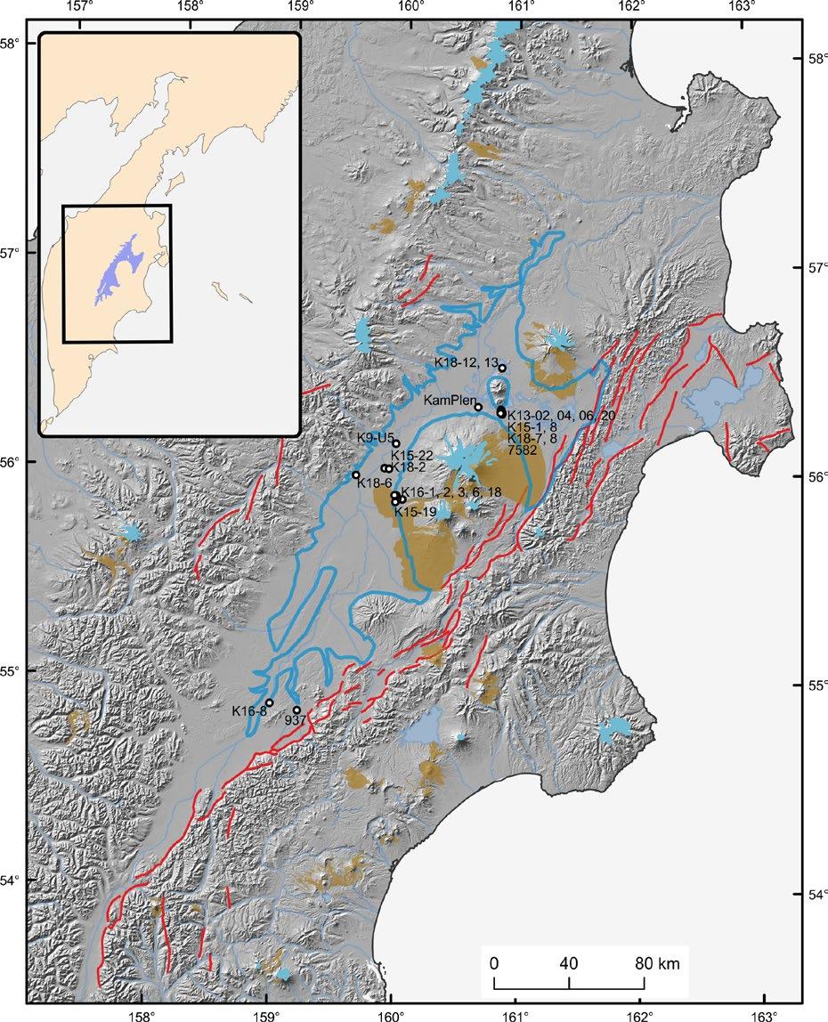 The evolution of Kamchatka landscapes remains poorly known even for the Late Pleistocene. Our recent tephrochronological studies based on the geochemical fingerprinting of volcanic glass particles and AMS 14C dating of host deposits provided a chronological lattice for the last 30 ka (Ponomareva et al., 2021). Dated lacustrine sediments revealed a period of simultaneous lacustrine deposition across the vast areas of the Central Kamchatka depression (CKD) that, together with fluvial topography pattern, indicates the existence of previously unknown giant lake within the CKD (Fig. 1).