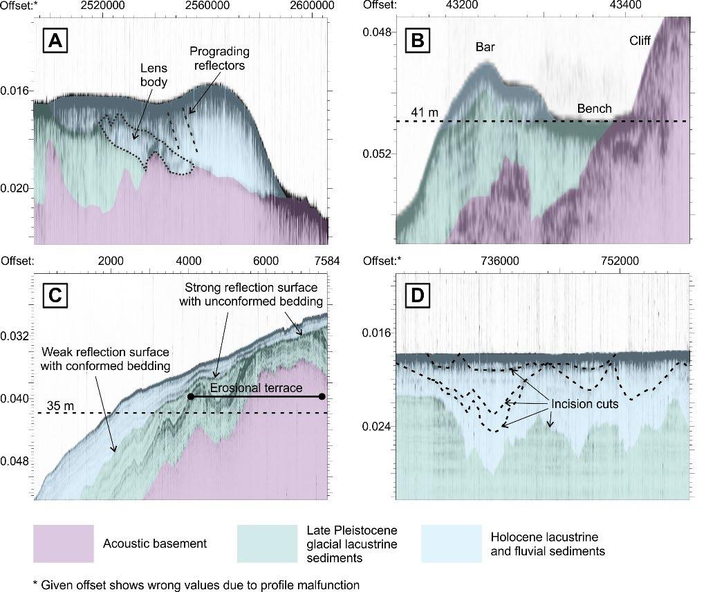 Two seismic units were defined. According to Lebas et al. (2021), we correlate them to Late Pleistocene glacial lacustrine sediments, mostly varved clays (the lower unit) and Holocene lacustrine sediments presented by silts, muds and sands (the upper unit).