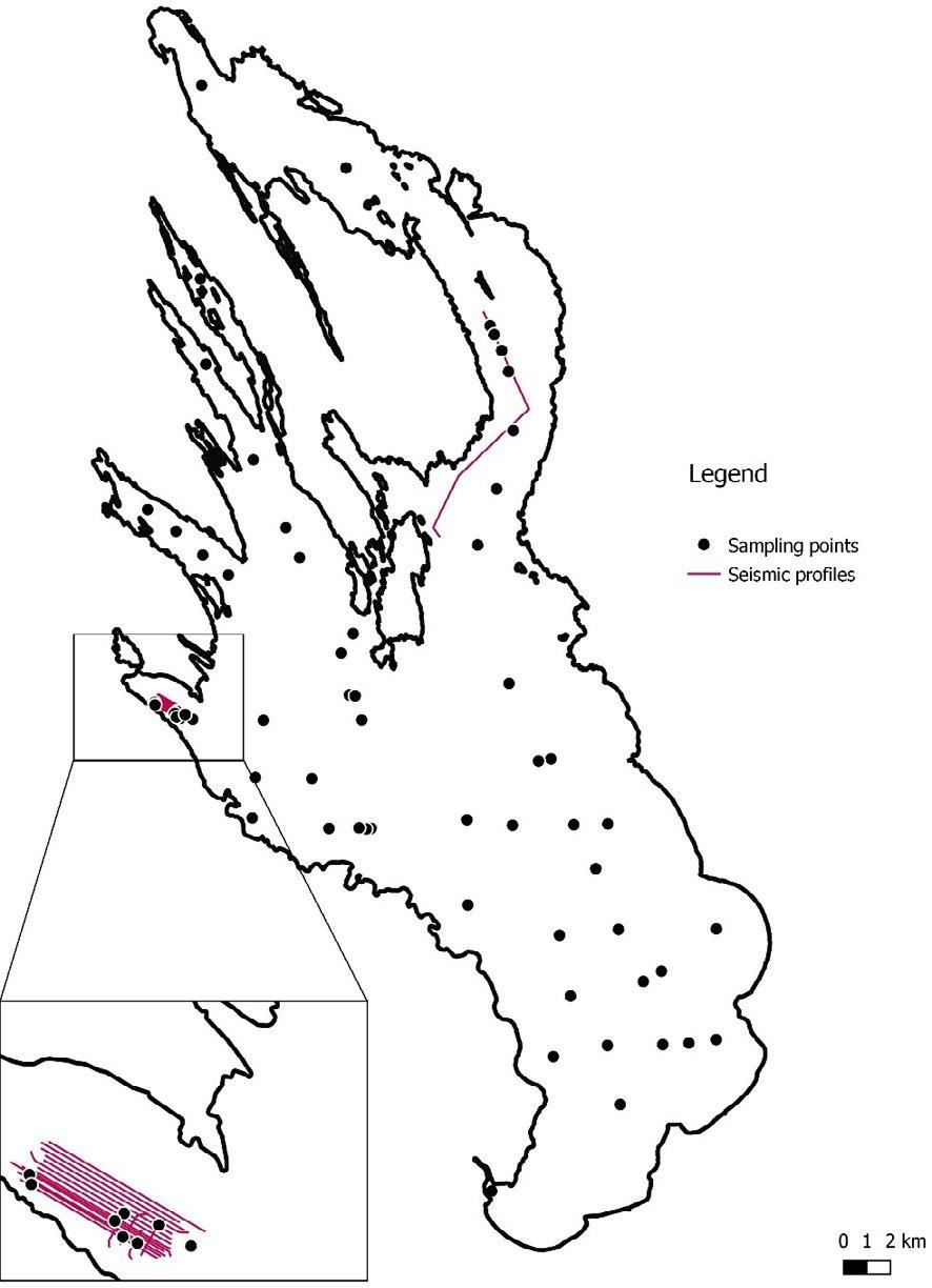 Fig.1. Map of fact material. Sampling points and seismic profiles.