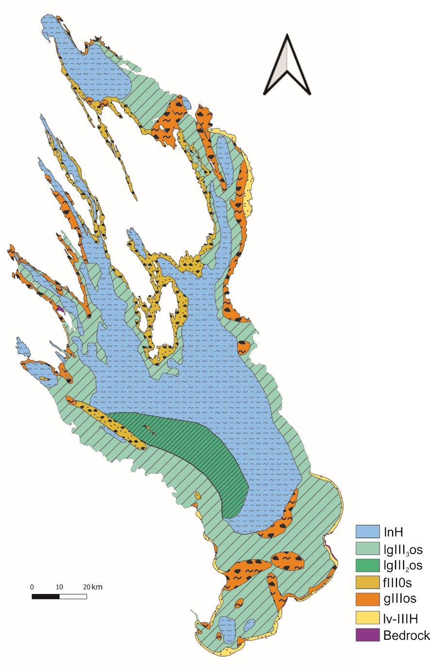 Also, at the bottom of Lake Onego pre-Quaternary bedrock exposures and undalluvium (lvIII-H) have been observed at the coastal part. Figure 2 shows the map of Quaternary sediments of Lake Onego.