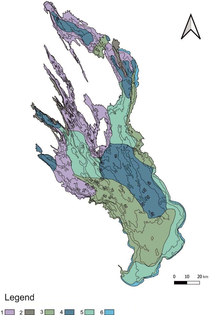 After analysis of data regarding Quaternary deposits and subbottom relief of Lake Onego, it became possible to describe geomorphological features of the lake. At the bottom of Lake Onego, six types of surfaces have been observed (Beliaev et al., 2020). Here is the description of these types: