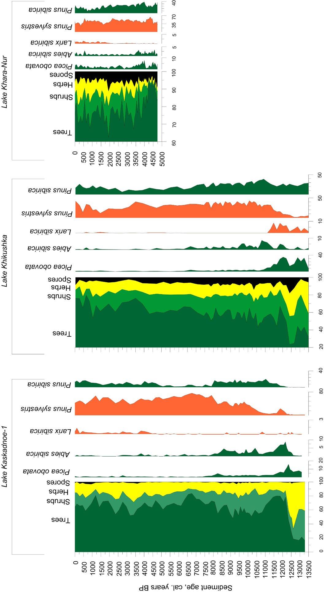 The pollen records indicates a considerable development of shrub and herb tundra around Kaskadnoe-1 and Khikushka lakes ca. 13.4-12.1 ka BP during cold climate. But rather high abundances of spruce Picea and larch Larix pollen indicate their presence around the lakes suggesting rather humid local environments (Fig.). Maxima in MS and DBD values in the records indicate a significant contribution of terrigenous material from the catchment area, probably carried by water originating from melting glaciers. Abies pollen rise since 12.1 ka BP points out to fir arrival close to Kaskadnoe-1 and Khikushka lakes under more favorable than earlier climate that lasted until ca. 8.0 ka BP (Fig.) being in line with predominantly warm and humid Early Holocene across western Mongolia and Altai and Baikal Regions (Klinge and Sauer, 2019). Warming favors the regional rather than local rise in the upper elevational limits of Pinus sibirica and the steady increase in Pinus sylvestris across the region since ca. 11.2 ka BP. An expansion of pines at higher elevations shortly after local deglaciation in the study area as opposed to their significantly later spread (7500-6000 ka BP) on plains of south East Siberia (Kobe et al., 2020) could be related to early spring melting and a longer growing season due to higher summer insolation. Although, other data support a predominantly treeless landscape in the lake basins ca. 8.0-4.5(4.0) ka BP. A strong reduction in dark coniferous fir and spruce trees in the middle Holocene in the lake basins could be a result of the higher-than-present summer insolation that could lead to warm summers, high evaporation and moisture deficit for dark coniferous trees.