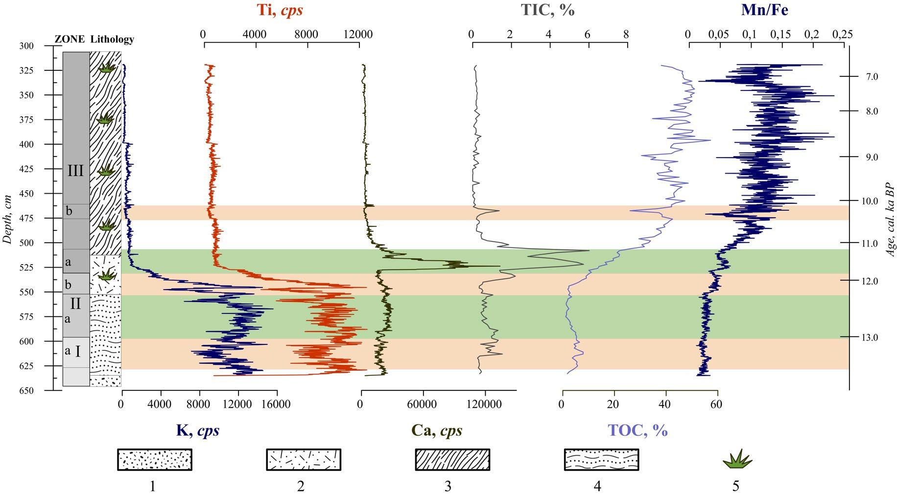 Fig. Lithology and vertical distribution of K, Ti, Ca, ratio Mn/Fe, TOC and TIC in Lake Khotavets sediments. Intensity of x-ray reflection is given in counts per second (cps). Age axis is built according to the age-depth modeling in ‘rbacon’. 1 –layered sandy silt, 2 – silt with organic matter, 3 – organic muds, 4 – rhythmically layered silt with organic matter, 5 – plant fossils
