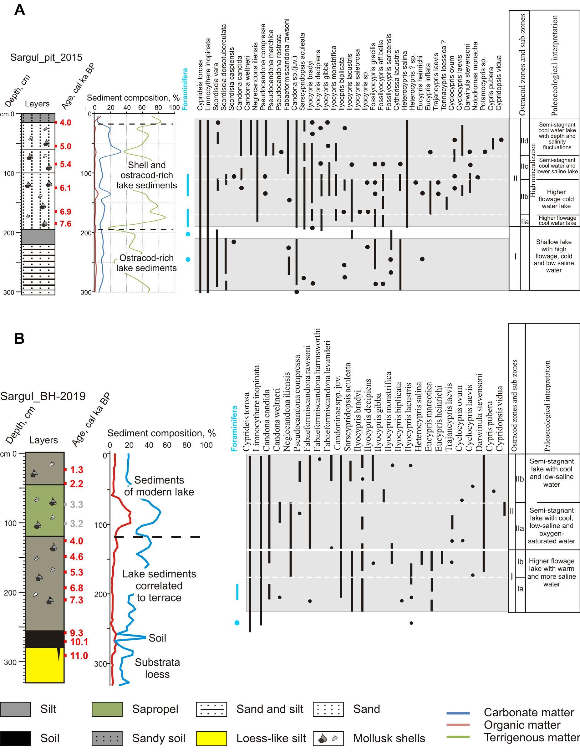 The Lake Sargul basin includes older lake terrace and the body of the modern lake (Krivonogov et al., 2018). The terrace sediments were investigated in the 150 cm deep pit continued by borehole to the depth of 300 cm, site Sargul_pit_2015 (N 54.58724°, E 78.92059°), in 2015 (Krivonogov et al., 2018). The lake sediments were investigated in the 336 cm long borehole, site Sargul_BH-2019 (N 54.592889°,E 78.873833°), in 2019 (Fig. 1). Both sites were sampled for microfaunal analysis with the interval of 10 cm, totally 56 samples. The analysis was performed with a standard technique. Radiocarbon dates were obtained from shells of mollusks, which are abundant in the sediments.