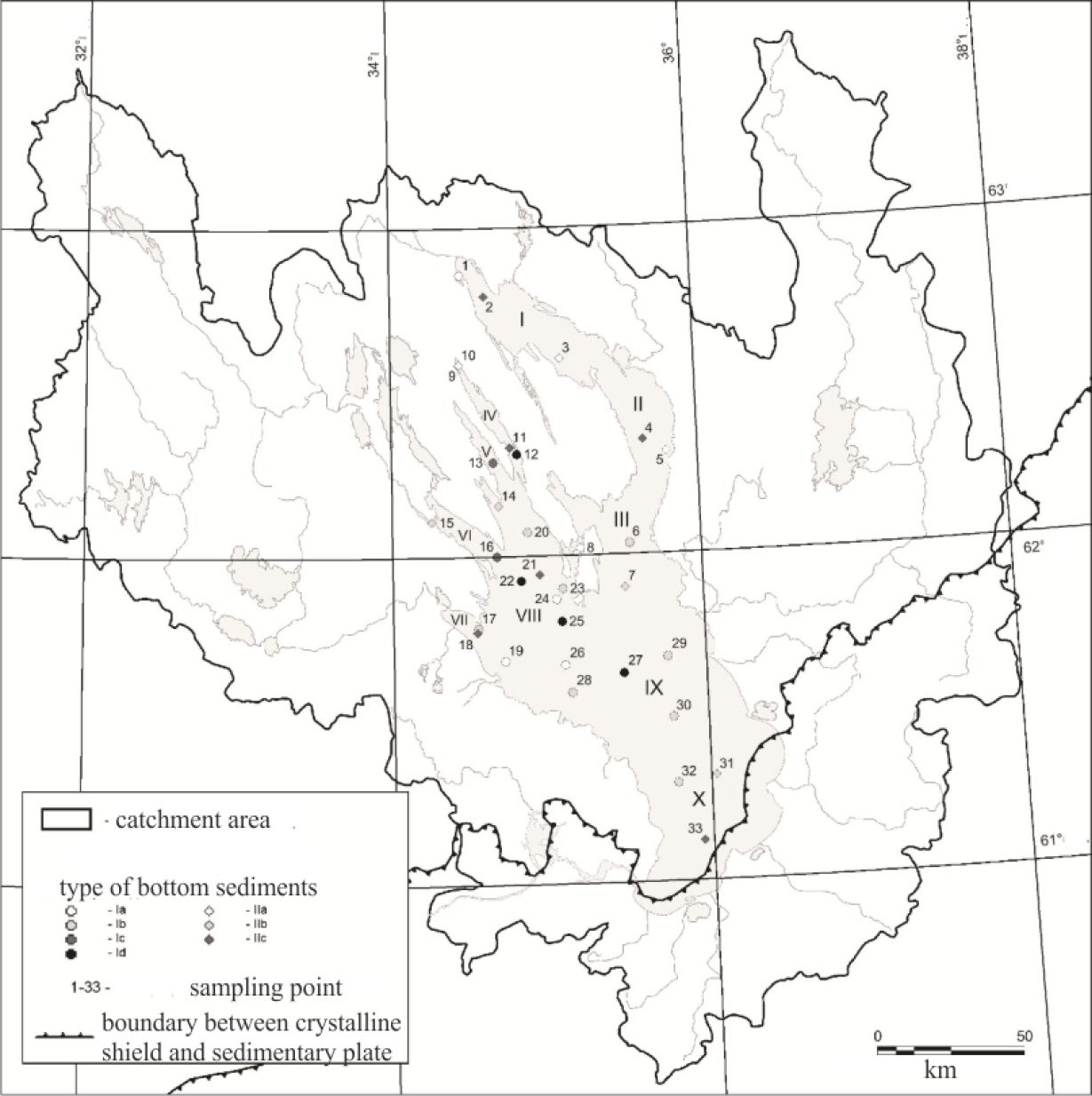Fig.1. Scheme for sampling the components of the lake ecosystem of Lake Onega. With removed and color-coded mercury content in the upper part of bottom sediments. I Povenetsky Bay; III Small Onego; IV Unitskaya Bay; V Lizhma Bay; VI Kondopoga Bay; VII Petrozavodsk Bay; VIII Big Onego; IX Central Onego; X South Onego. The points color shows the mercury content in the ranges 0.05 -0.08-0.11-0.14 μg/g from white to black.