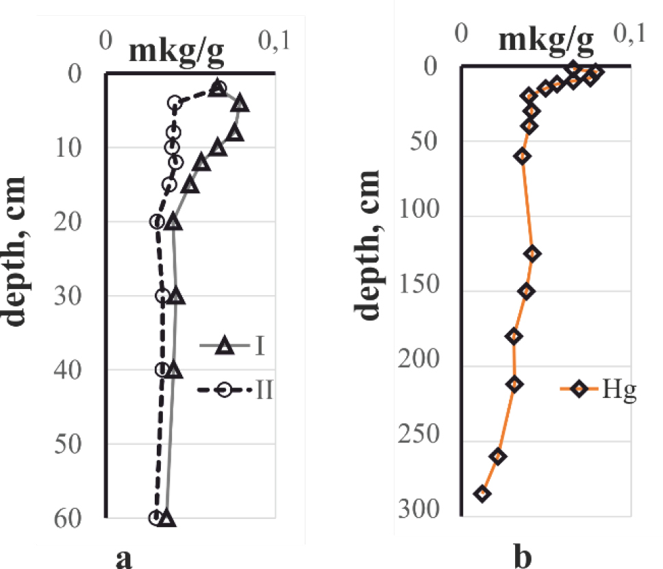- From the analysis of mercury concentrations in the section of bottom sediments, it was found that in the upper part of the section (up to 20 cm), the concentration is higher than in the lower part of the section (on average 0.065 µg/g and 0.034 µg/g for the upper and lower parts of the section, respectively).