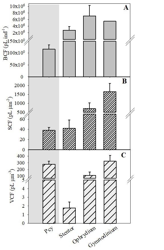 The S:V ratio indicated higher values in picoplankton (auto- and heterotrophic bacteria and Synechococcus; ca. 7.4 µm-1), followed by Gymnodinium (ca. 0.2 µm-1), Ophrydium (ca. 0.16 µm-1) and Stentor (ca. 0.04 µm-1).