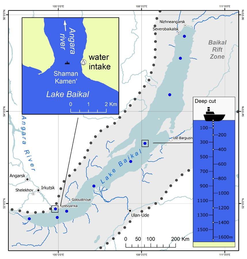 Fig.1. Scheme of water sampling in the Baikal aquatic ecosystem (Angara River source, surface and deep Baikal water, and water from the tributaries) for chemical analyses (Grebenshchikova et al., 2021).