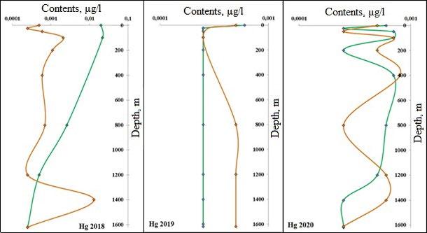 Fig.3. Distribution of Hg concentrations in Baikal water throughout the depth in 2018 to 2020.